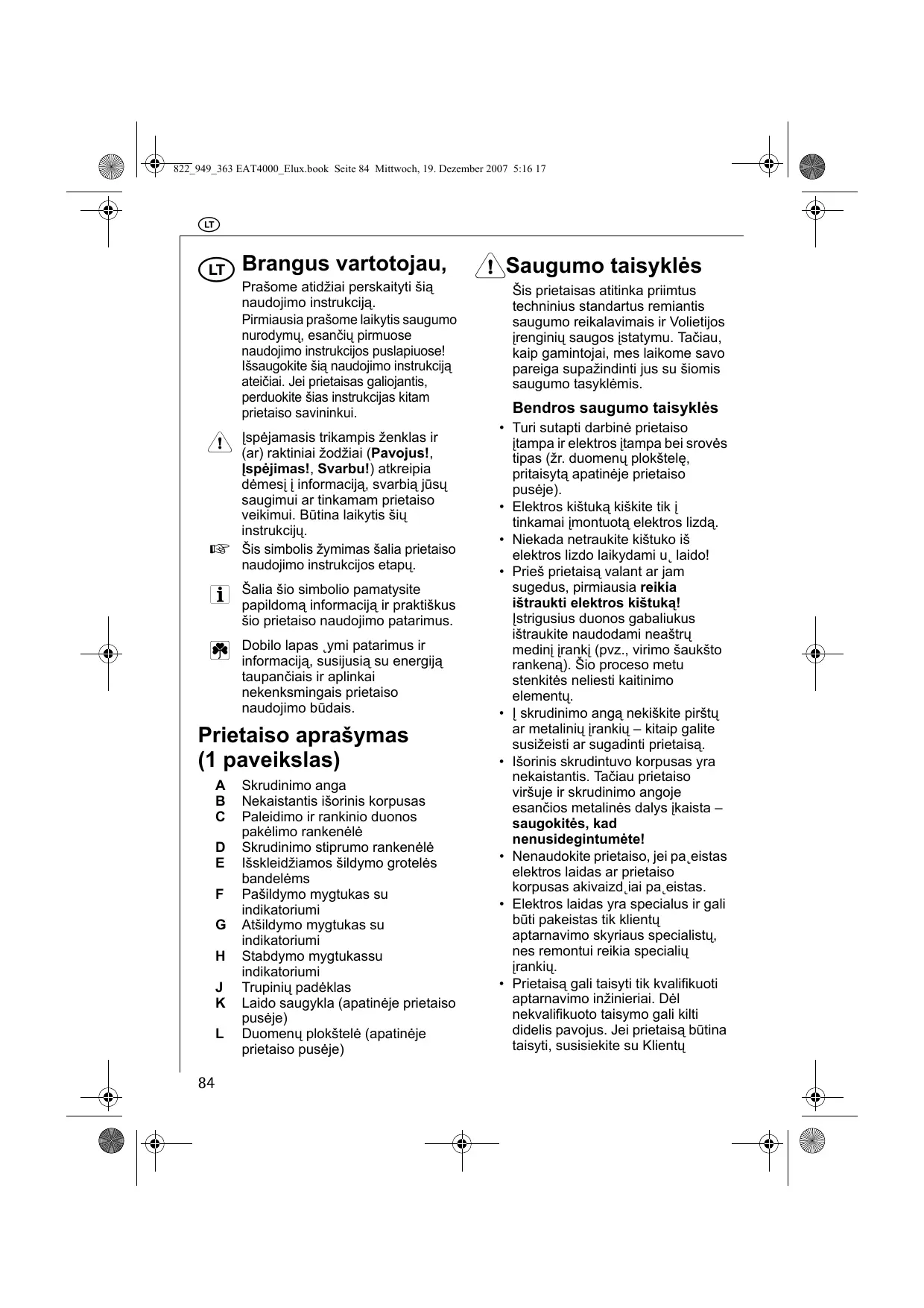 Lskrudinimo anga nekiškite pirstu ar metaliniu jrankiu - kitaip galite susižeisti ar sugadinti prietaisa.
