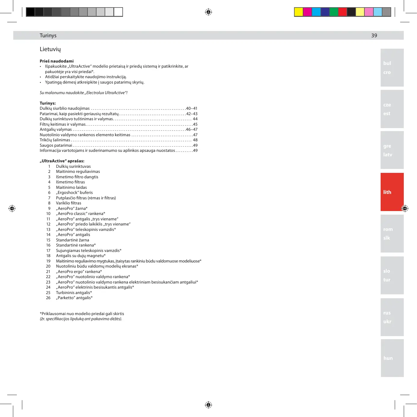 Turinys 39 Lietuviy Pries naudodami + lépakuokite .UltraActive” modelio prietaisa ir priedy sistema ir pati pakuotéje yra visi priedai*. + Atidäiai perskaitykite naudojimo instrukcija. + Ypatinga dèmesi atkreipkite | saugos patarimu skyriu, Su malonumu naudokite, Electrolux UltraActive"! siurblio naudojimas Patarimai, kaip pasiekti geriausiy rezultatu. Dulkiy surinktuvo tuétinimas ir valymas. Filtru keitimas ir valymas. Antgaliy valymas : Nuotolinio valdymo rankenos elemento keitimas Trikéiy Salinimas Saugos patarimai… ue ue Informacija vartotojams ir suderinamumo su aplinkos apsauga nuostatos . »UltraActive” apraëas: 1 Dulkiy surinktuvas 2 Maitinimo reguliavimas 3 l&metimo filtro dangtis 4 lémetimo filtras 5 Maitinimo laidas