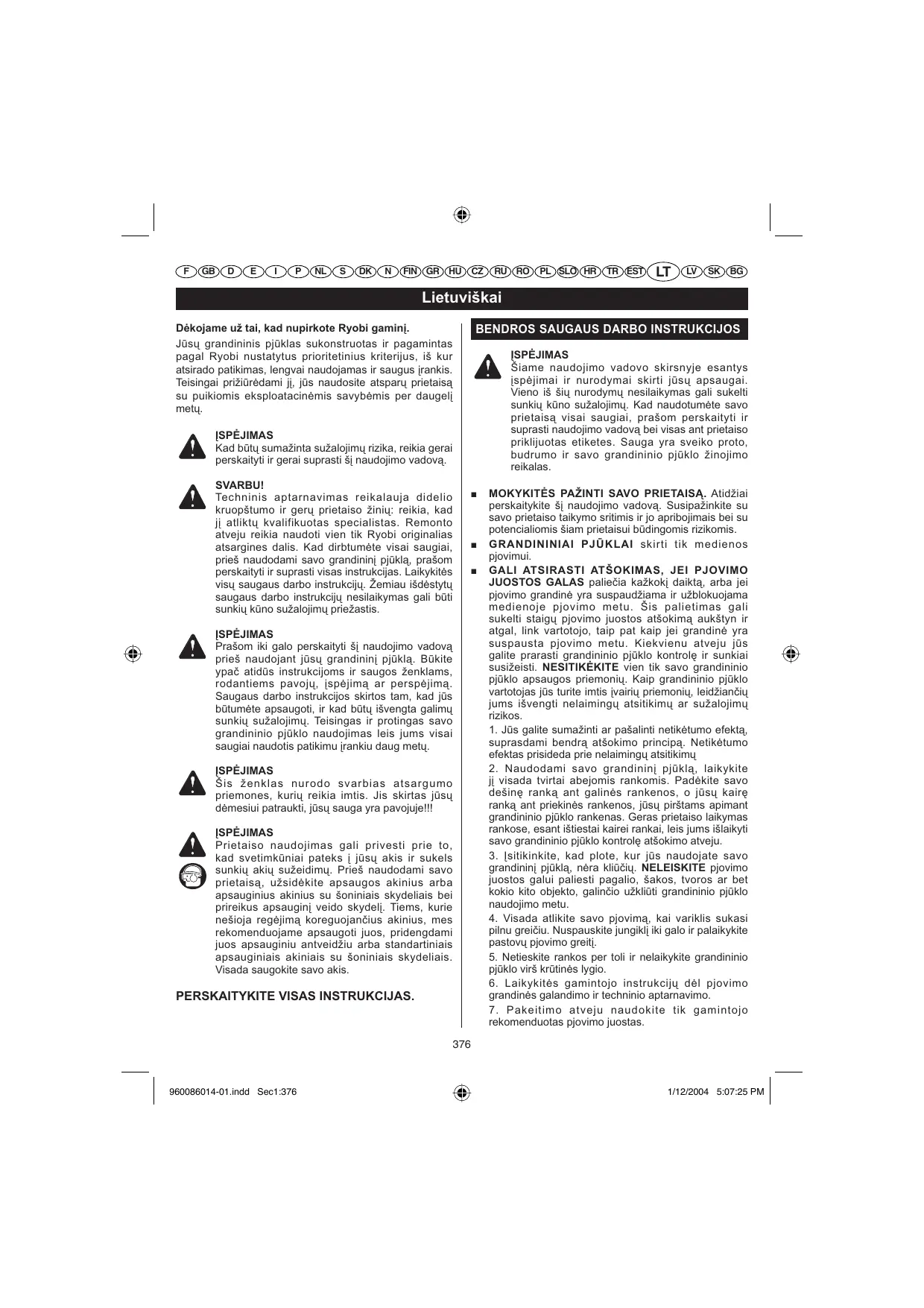 ĮSPĖJIMAS Šiame naudojimo vadovo skirsnyje esantys įspėjimai ir nurodymai skirti jūsų apsaugai. Vieno iš šių nurodymų nesilaikymas gali sukelti sunkių kūno sužalojimų. Kad naudotumėte savo prietaisą visai saugiai, prašom perskaityti ir suprasti naudojimo vadovą bei visas ant prietaiso priklijuotas etiketes. Sauga yra sveiko proto, budrumo ir savo grandininio pjūklo žinojimo reikalas. ĮSPĖJIMAS Kad būtų sumažinta sužalojimų rizika, reikia gerai perskaityti ir gerai suprasti šį naudojimo vadovą. SVARBU! Techninis aptarnavimas reikalauja didelio kruopštumo ir gerų prietaiso žinių: reikia, kad jį atliktų kvalifikuotas specialistas. Remonto atveju reikia naudoti vien tik Ryobi originalias atsargines dalis. Kad dirbtumėte visai saugiai, prieš naudodami savo grandininį pjūklą, prašom perskaityti ir suprasti visas instrukcijas. Laikykitės visų saugaus darbo instrukcijų. Žemiau išdėstytų saugaus darbo instrukcijų nesilaikymas gali būti sunkių kūno sužalojimų priežastis.