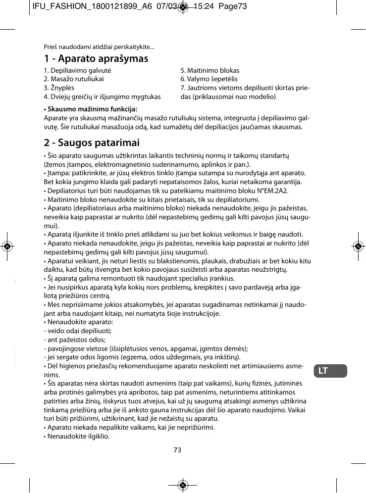 • Ne pas utiliser le bloc d'alimentation pour un autre usage que celui de l'épilateur. • Ne jamais utiliser l'appareil (épilateur ou bloc d'alimentation) s'il est endommagé, en cas d'anomalie de fonctionnement ou après une chute (des dommages non visibles peuvent être préjudiciables à votre sécurité). • Débranchez l’appareil avant toute intervention et après chaque utilisation. • N’utilisez jamais l’appareil s’il est endommagé, en cas d’anomalie de fonctionnement ou après une chute (des dommages non visibles peuvent être préjudiciables à votre sécurité). • Lorsque l’appareil est en marche, il ne doit pas rentrer en contact avec les cils, les cheveux, les vêtements, ou tout autre objet, afin d’éviter tout risque de blessure ou de blocage de l’appareil. • Cet appareil n’est réparable qu’à l’aide d’outils spéciaux. • Pour tout problème d’après-vente, adressez-vous à votre revendeur habituel ou à un Centre de Service agréé. • Nous déclinons toute responsabilité pour d’éventuels dommages résultant d’une mauvaise utilisation de l’appareil ou d’un usage autre que celui prévu dans la présente notice. • N’utilisez pas l’appareil : - sur le visage - sur une peau blessée - sur les zones à risques (varices, grains de beauté, marques de naissance) - si vous souffrez d’affections cutanées (eczéma, inflammations, acné). • Pour des raisons d’hygiène, nous vous recommandons de ne pas prêter votre appareil même dans votre environnement proche. • Cet appareil n’est pas prévu pour être utilisé par des personnes (y compris les enfants) dont les capacités physiques, sensorielles ou mentales sont réduites, ou des personnes 4