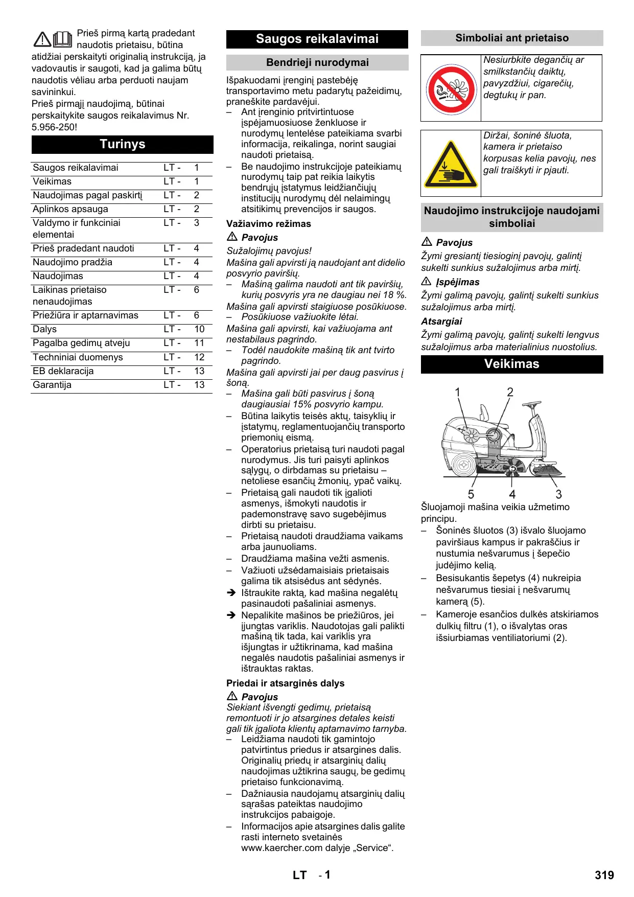 Saugos reikalavimai Simboliai ant prietaiso Nesiurbkite degančių ar smilkstančių daiktų, pavyzdžiui, cigarečių, degtukų ir pan. Bendrieji nurodymai Išpakuodami įrenginį pastebėję transportavimo metu padarytų pažeidimų, praneškite pardavėjui. – Ant įrenginio pritvirtintuose įspėjamuosiuose ženkluose ir nurodymų lentelėse pateikiama svarbi informacija, reikalinga, norint saugiai naudoti prietaisą. – Be naudojimo instrukcijoje pateikiamų nurodymų taip pat reikia laikytis bendrųjų įstatymus leidžiančiųjų institucijų nurodymų dėl nelaimingų atsitikimų prevencijos ir saugos. Važiavimo režimas Pavojus Sužalojimų pavojus! Mašina gali apvirsti ją naudojant ant didelio posvyrio paviršių. – Mašiną galima naudoti ant tik paviršių, kurių posvyris yra ne daugiau nei 18 %. Mašina gali apvirsti staigiuose posūkiuose. – Posūkiuose važiuokite lėtai. Mašina gali apvirsti, kai važiuojama ant nestabilaus pagrindo. – Todėl naudokite mašiną tik ant tvirto pagrindo. Mašina gali apvirsti jai per daug pasvirus į šoną. – Mašina gali būti pasvirus į šoną daugiausiai 15% posvyrio kampu. – Būtina laikytis teisės aktų, taisyklių ir įstatymų, reglamentuojančių transporto priemonių eismą. – Operatorius prietaisą turi naudoti pagal nurodymus. Jis turi paisyti aplinkos sąlygų, o dirbdamas su prietaisu – netoliese esančių žmonių, ypač vaikų. – Prietaisą gali naudoti tik įgalioti asmenys, išmokyti naudotis ir pademonstravę savo sugebėjimus dirbti su prietaisu. – Prietaisą naudoti draudžiama vaikams arba jaunuoliams. – Draudžiama mašina vežti asmenis. – Važiuoti užsėdamaisiais prietaisais galima tik atsisėdus ant sėdynės. Î Ištraukite raktą, kad mašina negalėtų pasinaudoti pašaliniai asmenys. Î Nepalikite mašinos be priežiūros, jei įjungtas variklis. Naudotojas gali palikti mašiną tik tada, kai variklis yra išjungtas ir užtikrinama, kad mašina negalės naudotis pašaliniai asmenys ir ištrauktas raktas. Diržai, šoninė šluota, kamera ir prietaiso korpusas kelia pavojų, nes gali traiškyti ir pjauti. Naudojimo instrukcijoje naudojami simboliai Pavojus Žymi gresiantį tiesioginį pavojų, galintį sukelti sunkius sužalojimus arba mirtį. 몇 Įspėjimas Žymi galimą pavojų, galintį sukelti sunkius sužalojimus arba mirtį. Atsargiai Žymi galimą pavojų, galintį sukelti lengvus sužalojimus arba materialinius nuostolius. Veikimas Šluojamoji mašina veikia užmetimo principu. – Šoninės šluotos (3) išvalo šluojamo paviršiaus kampus ir pakraščius ir nustumia nešvarumus į šepečio judėjimo kelią. – Besisukantis šepetys (4) nukreipia nešvarumus tiesiai į nešvarumų kamerą (5). – Kameroje esančios dulkės atskiriamos dulkių filtru (1), o išvalytas oras išsiurbiamas ventiliatoriumi (2). Priedai ir atsarginės dalys Pavojus Siekiant išvengti gedimų, prietaisą remontuoti ir jo atsargines detales keisti gali tik įgaliota klientų aptarnavimo tarnyba. – Leidžiama naudoti tik gamintojo patvirtintus priedus ir atsargines dalis. Originalių priedų ir atsarginių dalių naudojimas užtikrina saugų, be gedimų prietaiso funkcionavimą. – Dažniausia naudojamų atsarginių dalių sąrašas pateiktas naudojimo instrukcijos pabaigoje. – Informacijos apie atsargines dalis galite rasti interneto svetainės www.kaercher.com dalyje „Service“.