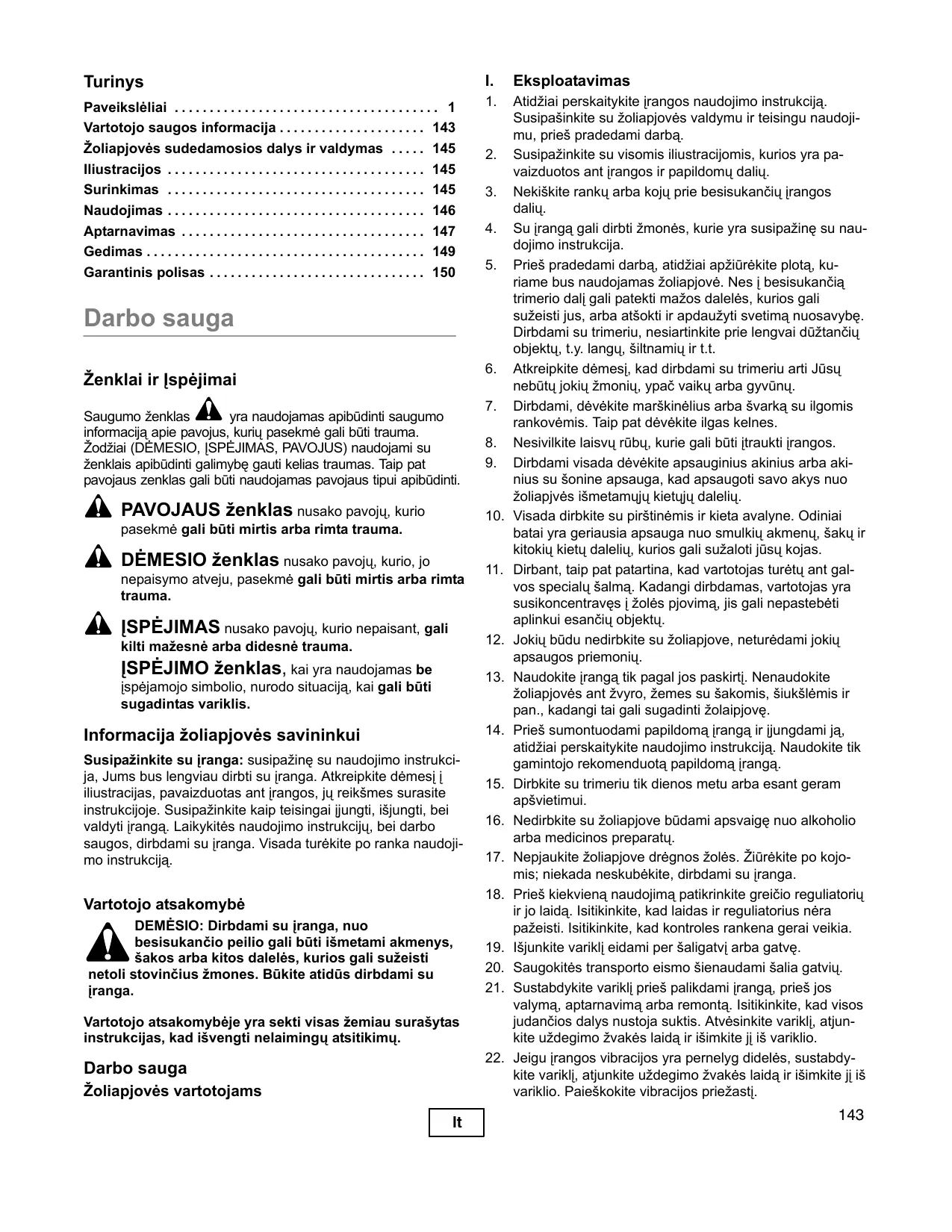 Prendre connaissance de toutes les étiquettes de sécurité et de fonctionnement présentes sur la machine, les équipements et les accessoires. Ne pas mettre les mains ou les pieds à proximité ou sous les parties tournantes. Ne confier l’utilisation de la tondeuse qu’à des personnes responsables, familiarisées avec les instructions. Inspecter la zone où la tondeuse sera utilisée. Celle-ci peut projeter à haute vitesse des petits objets pouvant provoquer des blessures ou des dégâts. Ne pas l’utiliser à proximité d’objets susceptibles de se casser tels que fenêtres, vitres de voiture, serres, etc. Ne laisser personne approcher de la zone de fonctionnement, en particulier les enfants et les animaux domestiques. Porter des vêtements appropriés comme une chemise à manches longues ou une veste. Porter aussi des pantalons ou salopettes. Ne pas porter de shorts. Ne pas porter de vêtements amples qui risqueraient de se prendre dans l’équipement. Toujours porter des lunettes de sécurité avec œillères de protection pendant l’utilisation de la tondeuse à conducteur marchant pour se protéger les yeux d’objets qui pourraient être projetés par la tondeuse Porter toujours des gants et des chaussures de travail. Des chaussures de travail ou des bottines en cuir sont appropriées pour pratiquement tout le monde. Elles protègent les chevilles et les tibias des petites branches, des échardes et autres débris et améliorent la mobilité. Il est recommandé de se munir d’une protection de la tête pour éviter le risque d’être touché par de petites particules volantes ou par des branches basses, brindilles ou autres objets que l’opérateur n’aurait pas remarqué. Ne jamais faire fonctionner la tondeuse à conducteur marchant sans ses protections, plaques ou autres dispositifs de sécurité. N’utiliser cet équipement que dans le cadre de son utilisation prévue. Ne pas faire passer la tondeuse sur des matériaux non fixés comme du gravier, des brindilles, des ordures, etc., qui présentent un risque de projection et d’endommagement de la tondeuse. Voir les instructions du fabricant pour l’installation et l’utilisation des accessoires. N’utiliser que des accessoires approuvés par le fabricant. N’utiliser qu’à la lumière du jour ou sous un éclairage artificiel suffisant. Ne pas faire fonctionner la tondeuse à conducteur marchant sous l’influence de l’alcool, de drogues ou de médicaments qui peuvent provoquer une somnolence ou affecter la capacité à l’utiliser. Ne pas utiliser la tondeuse à conducteur marchant avec de l’herbe humide. Avoir toujours le pied ferme, bien tenir la poignée et marcher, ne jamais courir. Avant chaque utilisation, inspecter le levier et le câble de la commande d’accélérateur. S’assurer que le câble n’est pas coincé et que le levier n’est pas endommagé. Vérifier aussi que les biellettes entre le câble et le carburateur ne sont pas tordues, n’ont pas perdu d’écrou et pivotent librement. Vérifier que le levier de commande fonctionne normalement. Couper le moteur pour traverser des allées, des passages ou des routes en gravier.