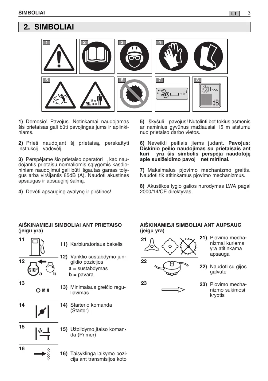 5) Iskysuli pavojus! Nutolinti bet tokius asmenis ar naminius gyvunus maiausiai 15 m atstumu nuo prietaiso darbo vietos.