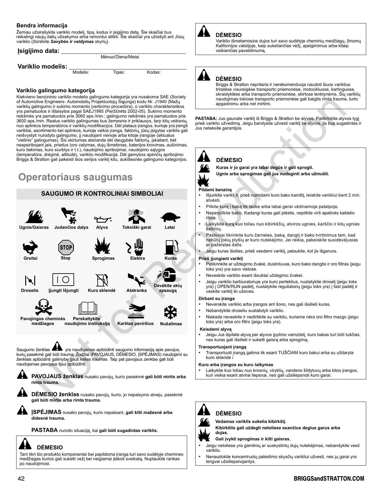 Bendra informacija Zemiau uésiraëykite variklio modeli, tipa, kodus ir isigijimo data. Sie skaïëiai bus reikalingi nauju daliy uzsakymuï arba remontui atikti. Sie skaiëlai yra uZraëyti ant Jüsy variklio (Ziürékite Savybés ir valdymas skyriu). Isigijimo data: Ménuo/Diena/Metai Variklio modelis: Models: Tipas: Kodas: Variklio galingumo kategorija Kiekvieno benzininio variklio modelio galingumo kategoria yra nusakoma SAE (Society of Automotive Engineers- Automobiliy Projektuotojy Sajunga) kodu Nr. 1940 (MaZu varikliy galingumo ir sukimo momento jvertinimo procedüra), o variklio charakteristikos yra pamatuotos ir iétaisytos pagal SAEJ1995 (PerZiüréta 2002-05). Sukimo momento reikëmés yra pamatuotos prie 3060 aps./min.: galingumo reikëmés yra pamatuotos prie 3600 aps./min. Realus variklio galingumas bus Zemesnis ir priklausys, tarp kity veiksniu, nuo aplinkos temperatüros ir varikliy modifikacijos. Dél plataus jrangos, kurioje yra jrengti varikliai, asortimento bei aplinkos, kurioje veikia jranga, faktoriu, jüsu isigytas variklis gali neïévystyti nurodyto galingumo, ji naudojant vienoje arba kitoje irangoje (aktualus “vietinis’ galingumas). Sis skitumas atsiranda dél daugybés faktori, iskaitant, bet neapsiribojant jais, priedus (oro valymas, duju iémetimas, baterijos krovimas, auëinimas, kuro tiekimas, kuro siurblys ir LL), naudojimo apribojimai, naudojmo salygos (temperatüra, drégmé, altitudé), variklio modifikacija. Dél gamybos apimëiu apribojmo Briggs & Stratton gali pakeisti 8ios serijos varikli kitu, aukëtesnés galingumo kategorijos. Operatoriaus saugumas