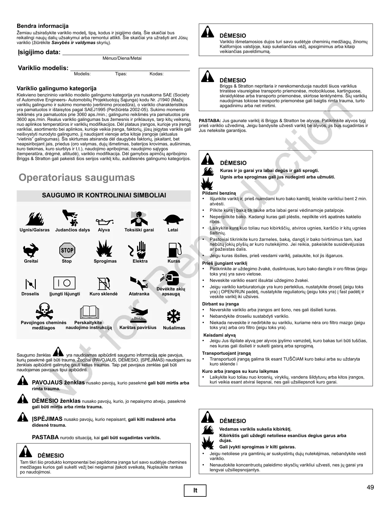 Bendra informacija Zemiau uésiraëykite variklio modeli, tipa, kodus ir jsigimo data. Sie skaiëiai bus reikalingi nauju daliy uzsakymuï arba remontui atikt. Sie skaiëlai yra uZraëyti ant Jüsy variklio (Ziürékite Savybés ir valdymas skyriu). Isigijimo data: À DÈMESIO Variklio i$metamosios dujos turi savo sudétyje cheminiy medziagu, Zinomy Kalifomijos valstioje, kaip sukelianëias vézi, apsigimimus arba kitaip veikianëias paveldimuma. Ménuo/Diena/Metai Variklio modelis: Models: Tipas: Kodas: Variklio galingumo kategorija Kiekvieno benzininio variklio modelio galingumo kategoria yra nusakoma SAE (Society of Automotive Engineers- Automobiliy Projektuotojy Sajunga) kodu Nr. 1940 (MaZu varikliy galingumo ir sukimo momento jvertinimo procedüra), o variklio charakteristikos yra pamatuotos ir iétaisytos pagal SAEJ1995 (PerZiüréta 2002-05). Sukimo momento reikëmés yra pamatuotos prie 3060 aps./min.: galingumo reikëmés yra pamatuotos prie 3600 aps./min. Realus variklio galingumas bus Zemesnis ir priklausys, tarp kity veiksniu, nuo aplinkos temperatüros ir varikliy modifikacijos. Dél plataus jrangos, kurioje yra jrengti varikliai, asortimento bei aplinkos, kurioje veikia jranga, faktoriu, jüsu isigytas variklis gali neïévystyti nurodyto galingumo, ji naudojant vienoje arba kitoje irangoje (aktualus “vietinis’ galingumas). Sis skitumas atsiranda dél daugybés faktori, iskaitant, bet neapsiribojant jais, priedus (oro valymas, duju iémetimas, baterijos krovimas, auëinimas, kuro tiekimas, kuro siurblys ir LL), naudojimo apribojimai, naudojmo salygos (temperatüra, drégmé, altitudé), variklio modifikacija. Dél gamybos apimëiu apribojmo Briggs & Stratton gali pakeisti 8ios serijos varikli kitu, aukëtesnés galingumo kategorijos. Operatoriaus saugumas