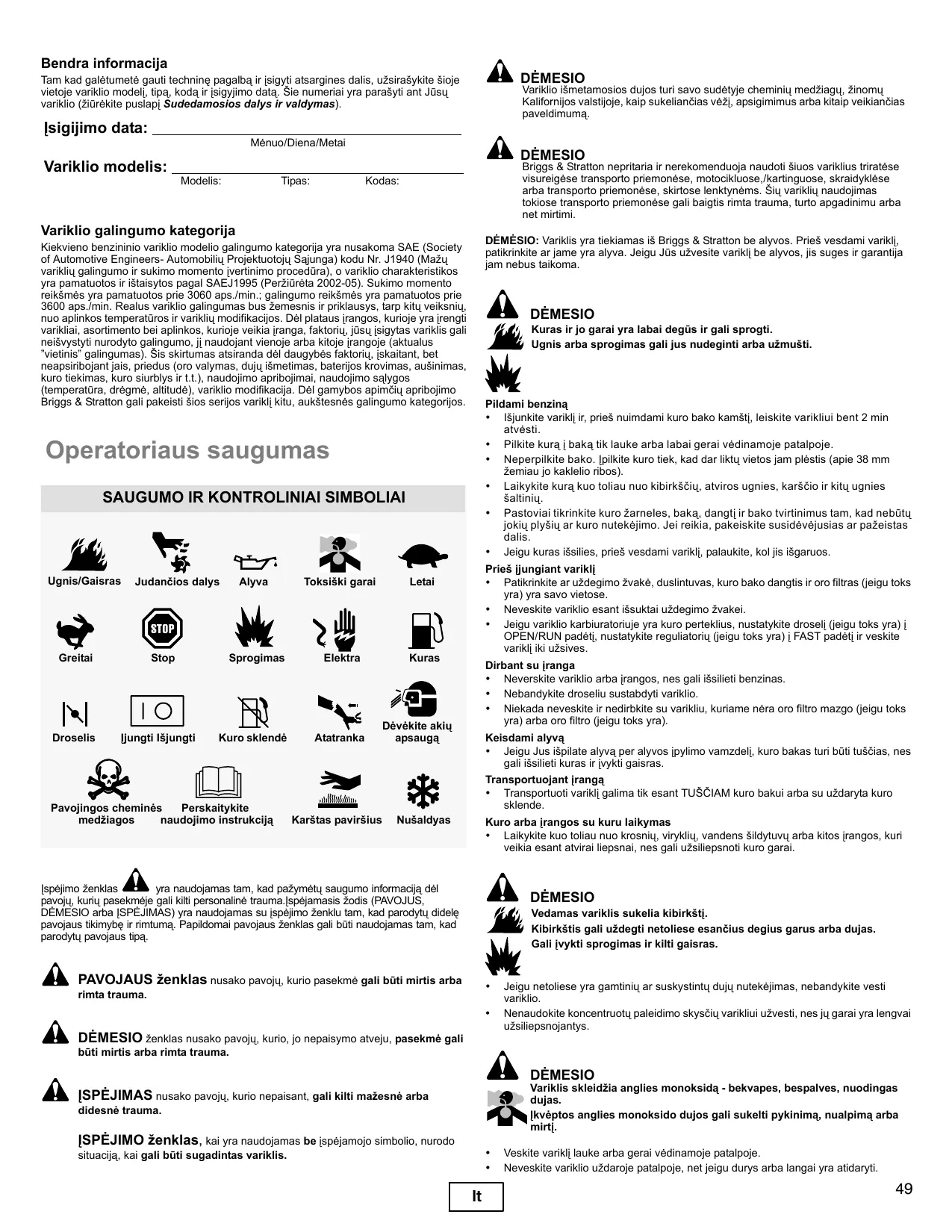 Bendra informacija Tam kad galétumeté gauti technine pagalba ir sigyti atsargines dalis, uZsiraëykite Sioje vietoje variklio model, tipa, koda ir isigyjimo data. Sie numeriai yra paraëyti ant Jüsu variklio (Zirékite puslapi Sudedamosios dalys ir valdymas). Isigijimo data: Ménuo/Diena/Metai Variklio modelis: Models: Tipas: Kodas: Variklio galingumo kategorija Kiekvieno benzininio variklio modelio galingumo kategoria yra nusakoma SAE (Society of Automotive Engineers- Automobiliy Projektuotojy Sajunga) kodu Nr. 1940 (MaZu varikliy galingumo ir sukimo momento jvertinimo procedüra), o variklio charakteristikos yra pamatuotos ir iétaisytos pagal SAEJ1995 (PerZiüréta 2002-05). Sukimo momento reikëmés yra pamatuotos prie 3060 aps./min.; galingumo reikëmés yra pamatuotos prie 3600 aps./min. Realus variklio galingumas bus Zemesnis ir priklausys, tarp kity veikSniu, nuo aplinkos temperatüros ir varikliy modifikacijos. Dél plataus jrangos, kurioje yra jrengti varikliai, asortimento bei aplinkos, kurioje veikia jranga, faktoriy, jüsu isigytas variklis gali neïévystyti nurodyto galingumo, ji naudojant vienoje arba kitoje irangoje (aktualus “vietinis” galingumas). Sis skitumas atsiranda dél daugybés faktori, iskaitant, bet neapsiribojant jais, priedus (oro valymas, duju iémetimas, baterijos krovimas, auëinimas, kuro tiekimas, kuro siurblys ir LL), naudojimo apribojimai, naudojmo salygos (temperatüra, drégmé, altitudé), variklio modifikacija. Dél gamybos apimëiu apribojimo Briggs & Stratton gali pakeisti 8ios serijos variklikitu, aukStesnés galingumo kategorios. Operatoriaus saugumas