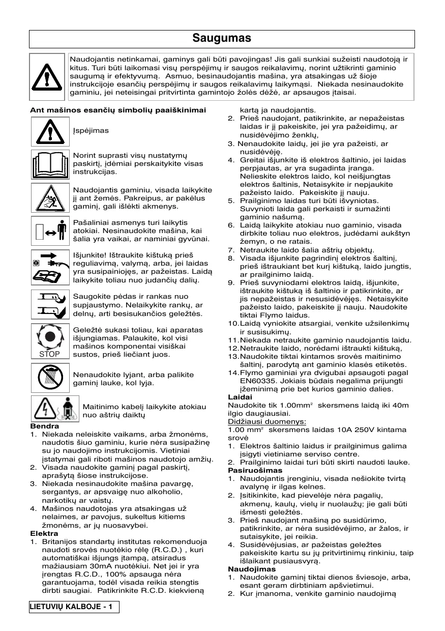 save. 10.Prieš stumiant gaminį kitais paviršiais nei žolė, išjunkite jį. 11.Niekada nenaudokite mašinos su pažeistom apsaugom, arba be jį. 12.Rankas ir pėdas laikykite atokiai nuo pjovimo srities, ypač įjungiant mašiną. 13.Nekilnokite gaminio, kol veikia variklis, ypač įjungiant ir išjungiant. Nekelkite daugiau, nei yra reikalinga, ir kelkite tik tą dalį, kuri yra toliau nuo naudotojo. Visada pasitikrinkite, kad abi rankos būtÅ naudojimo padėtyje prieš grąžinant įrenginį ant žemės. 14.Nelaikykite rankÅ šalia žolės išmetimo angos. 15.Niekada nekelkite ir neneškite įrenginio, kol jis dar veikia, ar yra prijungtas. 16.Ištraukite kištuką iš elektros šaltinio: - paliekant įrenginį be priežiūros bet kuriam laiko tarpui; - pašalinant blokavimą; - prieš tikrinant, valant, ar dirbant įrenginyje; - jei atsitrenkėt į objektą. Nenaudokite įrenginio, kol nesate visiškai įsitikinęs, kad galima juo toliau saugiai naudotis; - jei įrenginys pradės keistai drebėti. Tuoj pat patikrinkite. Perdėta vibracija gali sukelti sužalojimus. Eksploatavimas ir laikymas