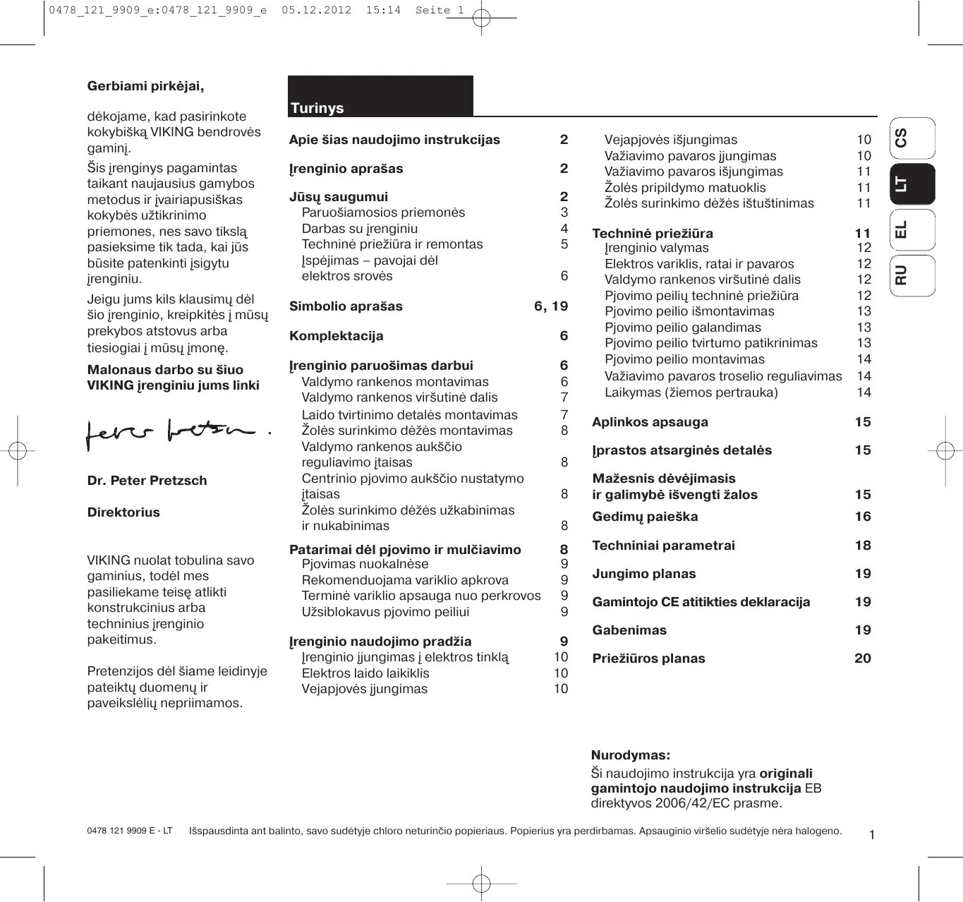Nurodymas: Ši naudojimo instrukcija yra originali gamintojo naudojimo instrukcija EB direktyvos 2006/42/EC prasme.