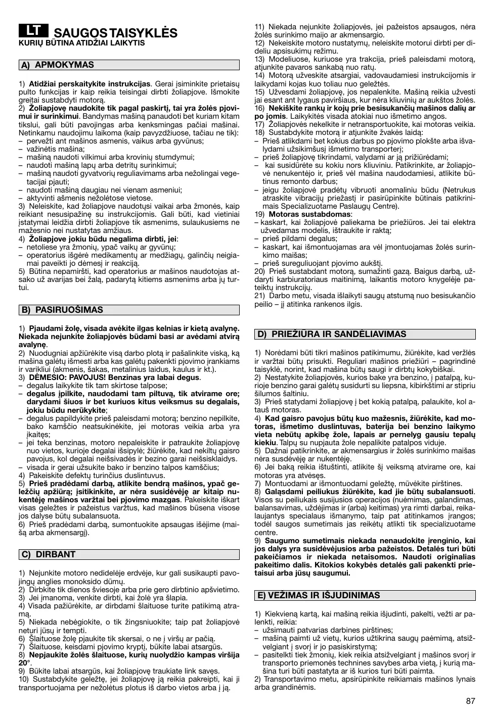 1) Toujours porter des chaussures résistantes et des pantalons longs pendant la tonte. Ne pas utiliser le matériel lorsque l’on est pieds nus ou en sandales. 2) Inspecter minutieusement toute la zone à tondre et éliminer tout objet étranger qui pourrait être projeté par la machine ou endommager l'ensemble de coupe et le moteur (pierres, morceaux de bois, fils de fer, os, etc..). 3) ATTENTION: DANGER! L’essence est hautement inflammable: – conserver le carburant dans des récipients spécialement prévus à cet effet; – faire le plein à l’aide d’un entonnoir, à l’extérieur uniquement et ne pas fumer pendant cette opération ou pendant toute manipulation de carburant; – ajouter de l’essence avant de démarrer le moteur et ne jamais enlever le bouchon du réservoir de carburant ou faire le plein lorsque le moteur est en fonctionnement ou tant qu’il est encore chaud; – ne pas démarrer le moteur si de l’essence a été répandue. Éloigner la tondeuse de la zone où le carburant a été renversé et ne provoquer aucune inflammation tant que le carburant ne s’est pas évaporé et que les vapeurs ne se sont pas dissipées; – remettre et serrer correctement les bouchons du réservoir et du récipient. 4) Remplacer les silencieux d’échappement défectueux. 5) Avant l’utilisation, toujours procéder à une vérification générale et en particulier de l’aspect des lames, des vis de fixation et de l’ensemble de coupe pour s’assurer qu’ils ne sont ni usés ni endommagés. Remplacer les lames et les vis endommagées ou usées par lots complets pour préserver le bon équilibrage. 6) Avant de commencer le travail, monter les protections (sac et déflecteur).