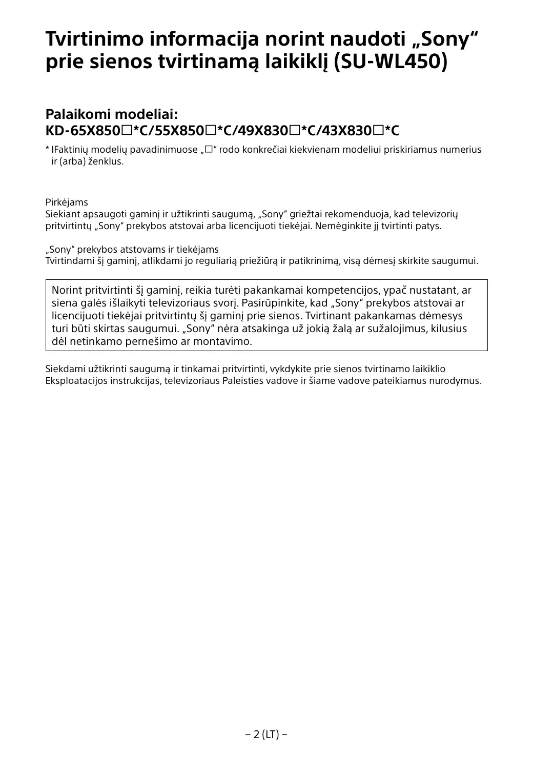 Norint pritvirtinti šį gaminį, reikia turėti pakankamai kompetencijos, ypač nustatant, ar siena galės išlaikyti televizoriaus svorį. Pasirūpinkite, kad „Sony“ prekybos atstovai ar licencijuoti tiekėjai pritvirtintų šį gaminį prie sienos. Tvirtinant pakankamas dėmesys turi būti skirtas saugumui. „Sony“ nėra atsakinga už jokią žalą ar sužalojimus, kilusius dėl netinkamo pernešimo ar montavimo. Siekdami užtikrinti saugumą ir tinkamai pritvirtinti, vykdykite prie sienos tvirtinamo laikiklio Eksploatacijos instrukcijas, televizoriaus Paleisties vadove ir šiame vadove pateikiamus nurodymus.