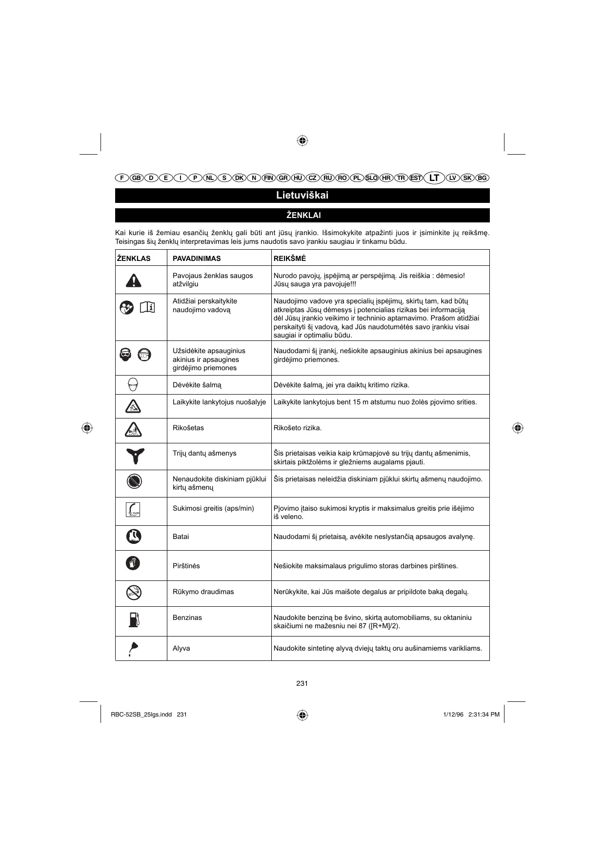 Lietuviškai ŽENKLAI Kai kurie iš žemiau esančių ženklų gali būti ant jūsų įrankio. Išsimokykite atpažinti juos ir įsiminkite jų reikšmę. Teisingas šių ženklų interpretavimas leis jums naudotis savo įrankiu saugiau ir tinkamu būdu. ŽENKLAS PAVADINIMAS REIKŠMĖ Pavojaus ženklas saugos atžvilgiu Nurodo pavojų, įspėjimą ar perspėjimą. Jis reiškia : dėmesio! Jūsų sauga yra pavojuje!!! Atidžiai perskaitykite naudojimo vadovą Naudojimo vadove yra specialių įspėjimų, skirtų tam, kad būtų atkreiptas Jūsų dėmesys į potencialias rizikas bei informaciją dėl Jūsų įrankio veikimo ir techninio aptarnavimo. Prašom atidžiai perskaityti šį vadovą, kad Jūs naudotumėtės savo įrankiu visai saugiai ir optimaliu būdu. Užsidėkite apsauginius akinius ir apsaugines girdėjimo priemones Naudodami šį įrankį, nešiokite apsauginius akinius bei apsaugines girdėjimo priemones. Dėvėkite šalmą Dėvėkite šalmą, jei yra daiktų kritimo rizika. Laikykite lankytojus nuošalyje Laikykite lankytojus bent 15 m atstumu nuo žolės pjovimo srities. Rikošetas Rikošeto rizika. Trijų dantų ašmenys Šis prietaisas veikia kaip krūmapjovė su trijų dantų ašmenimis, skirtais piktžolėms ir gležniems augalams pjauti. Nenaudokite diskiniam pjūklui kirtų ašmenų Šis prietaisas neleidžia diskiniam pjūklui skirtų ašmenų naudojimo. Sukimosi greitis (aps/min) Pjovimo įtaiso sukimosi kryptis ir maksimalus greitis prie išėjimo iš veleno. Batai Naudodami šį prietaisą, avėkite neslystančią apsaugos avalynę. Pirštinės Nešiokite maksimalaus prigulimo storas darbines pirštines. Rūkymo draudimas Nerūkykite, kai Jūs maišote degalus ar pripildote baką degalų. Benzinas Naudokite benziną be švino, skirtą automobiliams, su oktaniniu skaičiumi ne mažesniu nei 87 ([R+M]/2). Alyva Naudokite sintetinę alyvą dviejų taktų oru aušinamiems varikliams.
