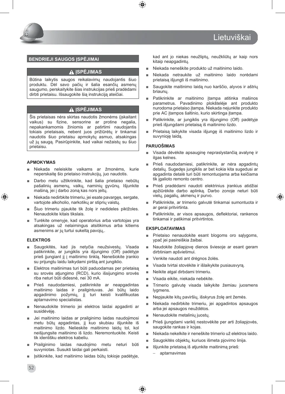 Šiuo trimeriu pjaukite tik žolę ir nedideles piktžoles. Nenaudokite kitais tikslais. Patikrinkite, ar trimerio galvutė tinkamai sumontuota ir ar gerai pritvirtinta.