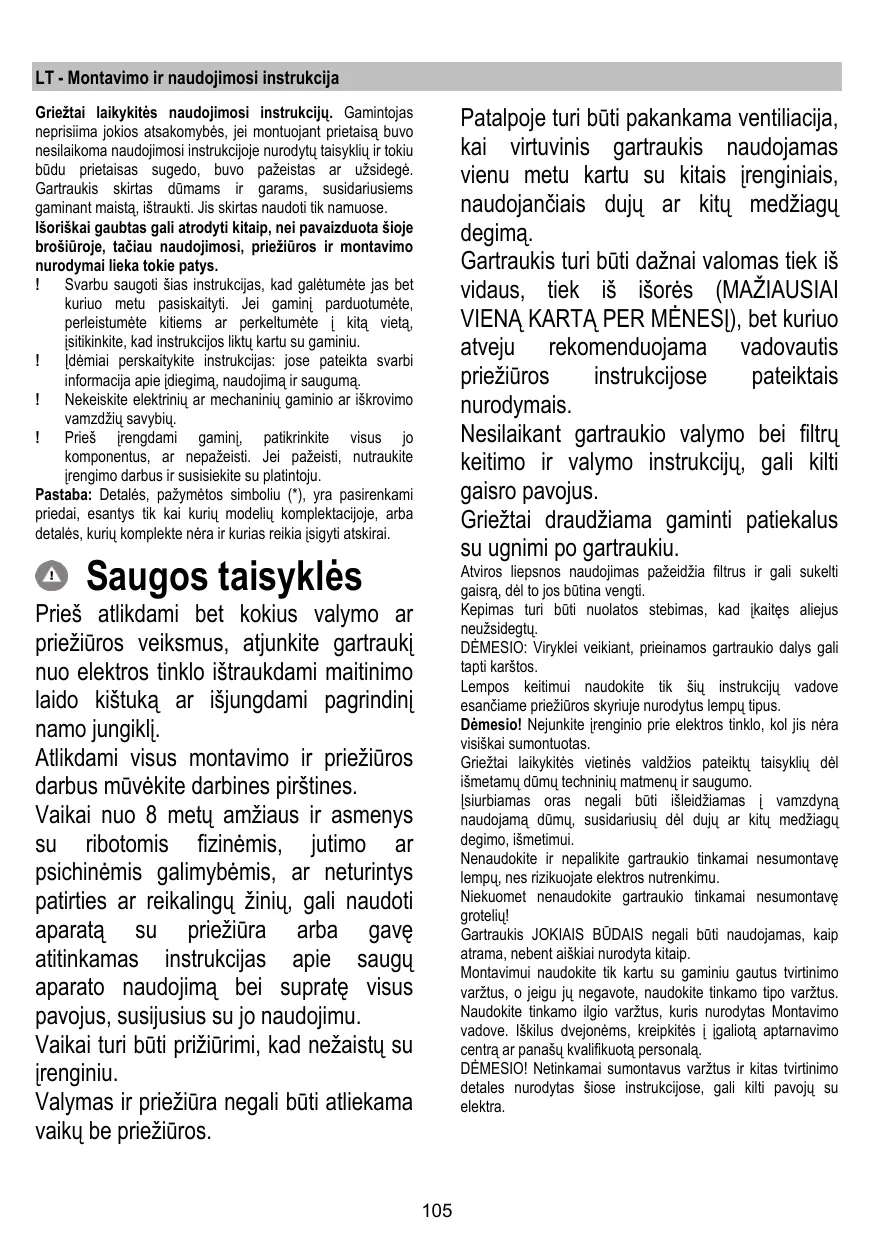 LT - Montavimo ir naudojimosi instrukcija Griežtai laikykitės naudojimosi instrukcijų. Gamintojas neprisiima jokios atsakomybės, jei montuojant prietaisą buvo nesilaikoma naudojimosi instrukcijoje nurodytų taisyklių ir tokiu būdu prietaisas sugedo, buvo pažeistas ar užsidegė. Gartraukis skirtas dūmams ir garams, susidariusiems gaminant maistą, ištraukti. Jis skirtas naudoti tik namuose. Išoriškai gaubtas gali atrodyti kitaip, nei pavaizduota šioje brošiūroje, tačiau naudojimosi, priežiūros ir montavimo nurodymai lieka tokie patys. Svarbu saugoti šias instrukcijas, kad galėtumėte jas bet kuriuo metu pasiskaityti. Jei gaminį parduotumėte, perleistumėte kitiems ar perkeltumėte į kitą vietą, įsitikinkite, kad instrukcijos liktų kartu su gaminiu. Įdėmiai perskaitykite instrukcijas: jose pateikta svarbi informacija apie įdiegimą, naudojimą ir saugumą. Nekeiskite elektrinių ar mechaninių gaminio ar iškrovimo vamzdžių savybių. Prieš įrengdami gaminį, patikrinkite visus jo komponentus, ar nepažeisti. Jei pažeisti, nutraukite įrengimo darbus ir susisiekite su platintoju. Pastaba: Detalės, pažymėtos simboliu (*), yra pasirenkami priedai, esantys tik kai kurių modelių komplektacijoje, arba detalės, kurių komplekte nėra ir kurias reikia įsigyti atskirai. Patalpoje turi būti pakankama ventiliacija, kai virtuvinis gartraukis naudojamas vienu metu kartu su kitais įrenginiais, naudojančiais dujų ar kitų medžiagų degimą. Gartraukis turi būti dažnai valomas tiek iš vidaus, tiek iš išorės (MAŽIAUSIAI VIENĄ KARTĄ PER MĖNESĮ), bet kuriuo atveju rekomenduojama vadovautis priežiūros instrukcijose pateiktais nurodymais. Nesilaikant gartraukio valymo bei filtrų keitimo ir valymo instrukcijų, gali kilti gaisro pavojus. Griežtai draudžiama gaminti patiekalus su ugnimi po gartraukiu. Saugos taisyklės Atviros liepsnos naudojimas pažeidžia filtrus ir gali sukelti gaisrą, dėl to jos būtina vengti. Kepimas turi būti nuolatos stebimas, kad įkaitęs aliejus neužsidegtų. DĖMESIO: Viryklei veikiant, prieinamos gartraukio dalys gali tapti karštos. Lempos keitimui naudokite tik šių instrukcijų vadove esančiame priežiūros skyriuje nurodytus lempų tipus. Dėmesio! Nejunkite įrenginio prie elektros tinklo, kol jis nėra visiškai sumontuotas. Griežtai laikykitės vietinės valdžios pateiktų taisyklių dėl išmetamų dūmų techninių matmenų ir saugumo. Įsiurbiamas oras negali būti išleidžiamas į vamzdyną naudojamą dūmų, susidariusių dėl dujų ar kitų medžiagų degimo, išmetimui. Nenaudokite ir nepalikite gartraukio tinkamai nesumontavę lempų, nes rizikuojate elektros nutrenkimu. Niekuomet nenaudokite gartraukio tinkamai nesumontavę grotelių! Gartraukis JOKIAIS BŪDAIS negali būti naudojamas, kaip atrama, nebent aiškiai nurodyta kitaip. Montavimui naudokite tik kartu su gaminiu gautus tvirtinimo varžtus, o jeigu jų negavote, naudokite tinkamo tipo varžtus. Naudokite tinkamo ilgio varžtus, kuris nurodytas Montavimo vadove. Iškilus dvejonėms, kreipkitės į įgaliotą aptarnavimo centrą ar panašų kvalifikuotą personalą. DĖMESIO! Netinkamai sumontavus varžtus ir kitas tvirtinimo detales nurodytas šiose instrukcijose, gali kilti pavojų su elektra. Prieš atlikdami bet kokius valymo ar priežiūros veiksmus, atjunkite gartraukį nuo elektros tinklo ištraukdami maitinimo laido kištuką ar išjungdami pagrindinį namo jungiklį. Atlikdami visus montavimo ir priežiūros darbus mūvėkite darbines pirštines. Vaikai nuo 8 metų amžiaus ir asmenys su ribotomis fizinėmis, jutimo ar psichinėmis galimybėmis, ar neturintys patirties ar reikalingų žinių, gali naudoti aparatą su priežiūra arba gavę atitinkamas instrukcijas apie saugų aparato naudojimą bei supratę visus pavojus, susijusius su jo naudojimu. Vaikai turi būti prižiūrimi, kad nežaistų su įrenginiu. Valymas ir priežiūra negali būti atliekama vaikų be priežiūros.