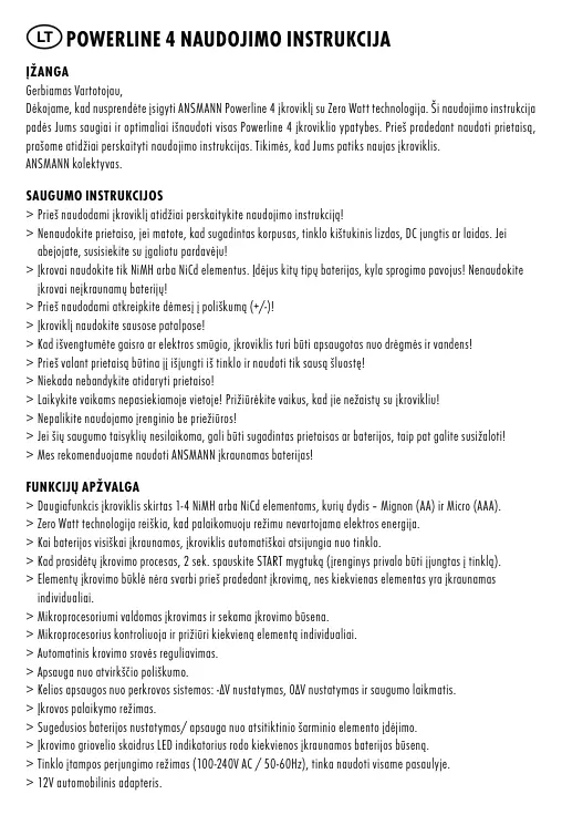 > Merci de lire attentivement les consignes de sécurité avant d’utiliser ce chargeur! > Ne pas utiliser le chargeur si celui-ci présente quelconque signe de défectuosité au niveau du boitier, de la prise secteur, de la prise véhicule, ou des câbles. En cas de doute, veuillez contacter votre point de vente ou un centre agrée. > Ne charger que des accumulateurs rechargeables NiMH ou NiCd. Danger d’explosion en cas d’insertion d’autre type de batteries. Ne pas essayer de charger des piles non rechargeables. > Respecter les polarités (+/-) > Garder le chargeur dans un endroit sec! > Le chargeur doit être protégé de l’eau et de la forte humidité afin d’éviter tout risque de court circuit et/ou d’incendie! > Toujours le débrancher de la prise secteur avant de le nettoyer et utiliser un chiffon propre et sec! > Ne jamais essayer d’ouvrir ou de démonter l’appareil! > Ne pas laisser à la portée des enfants ! cet appareil n’est pas un jouet! > Surveiller l’appareil lors de son fonctionnement ! > Le non respect de ces consignes de sécurité peut entrainer des problèmes à l’utilisateur ou endommager l’appareil! > Nous vous recommandons d’utiliser des accumulateurs rechargeables de la marquee ANSMANN ! GENERALITES > Chargeur intelligent pour 1-4 accumulateur NiMH ou NiCd de format LR6 (AA) et LR3 (AAA) > La technologie Zéro Watt évite la mise en veille de l’appareil. Le chargeur se coupe automatiquement et complètement du secteur une fois les éléments pleinement chargés. > Pour commencer la charge, appuyer sur le bouton “START” pendant environ 2 sec. (valable uniquement sur prise secteur) > L’état de charge des accumulateurs n’est pas important car le chargeur fait un diagnostic individuel de chaque élément avant leur mise en charge. > Un microprocesseur contrôle et supervise le processus de charge de chaque accumulateur, et ce, individuellement. > Courant de charge automatiquement ajusté > Protection contre l’inversion de polarité > Multiples systèmes de protection contre la surcharge tels que : détection -ΔV, détection 0ΔV et timer de sécurité > Charge d’entretien > Détection d’accumulateur défectueux / détection en cas d’insertion accidentelle de piles alcalines > Indicateurs (LED) par canal de charge indiquant l’état de charge de chaque accumulateur inséré. > Alimentation universelle (100-240V AC / 50-60Hz) pour usage dans le monde entier > Adaptateur allume cigares 12V pour usage dans une voiture