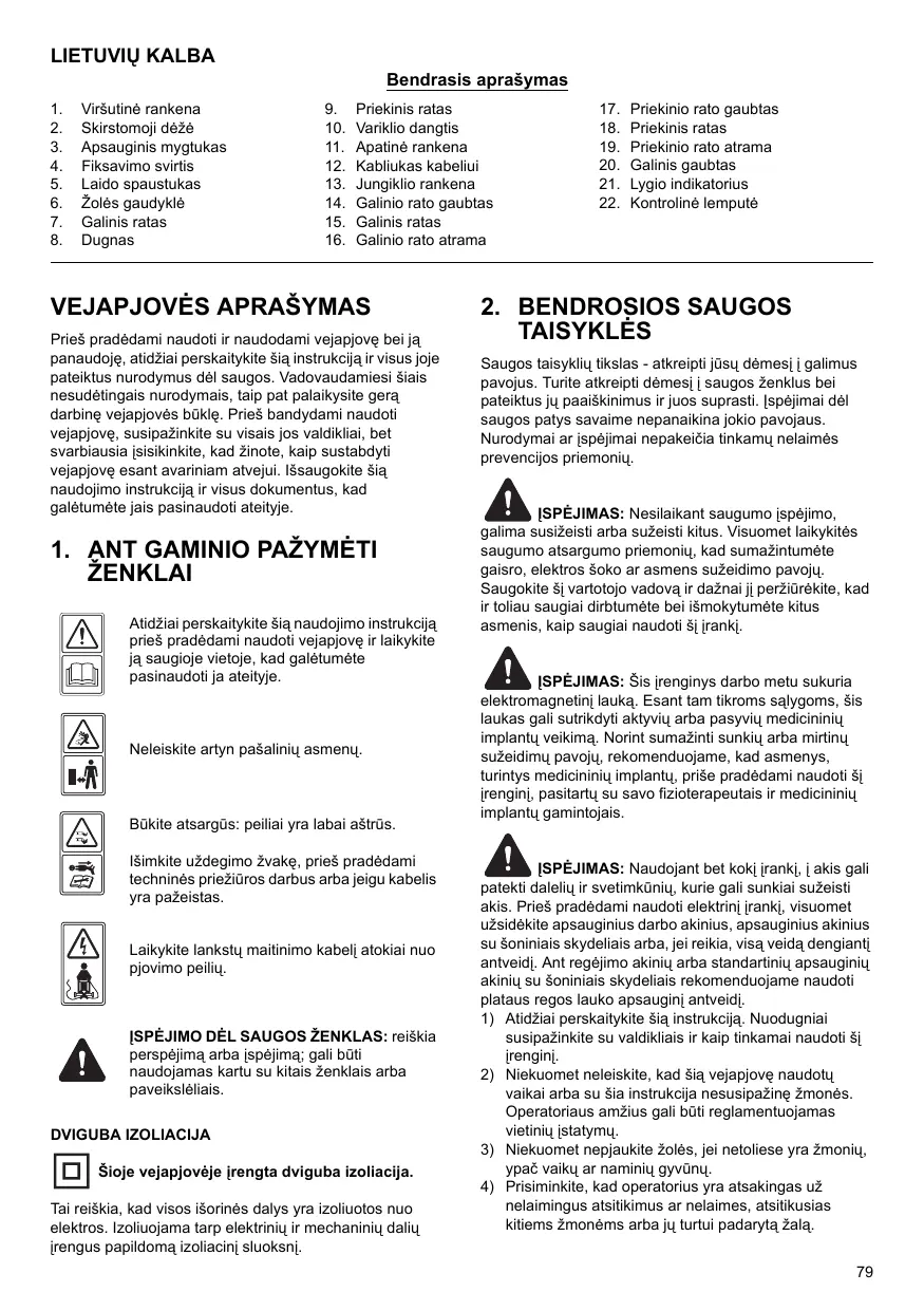 1. SYMBOLES MARQUÉS SUR LE PRODUIT Lisez ce manuel d’instructions attentivement avant d’utiliser la tondeuse et conservez-le dans un endroit sûr pour toute référence future.