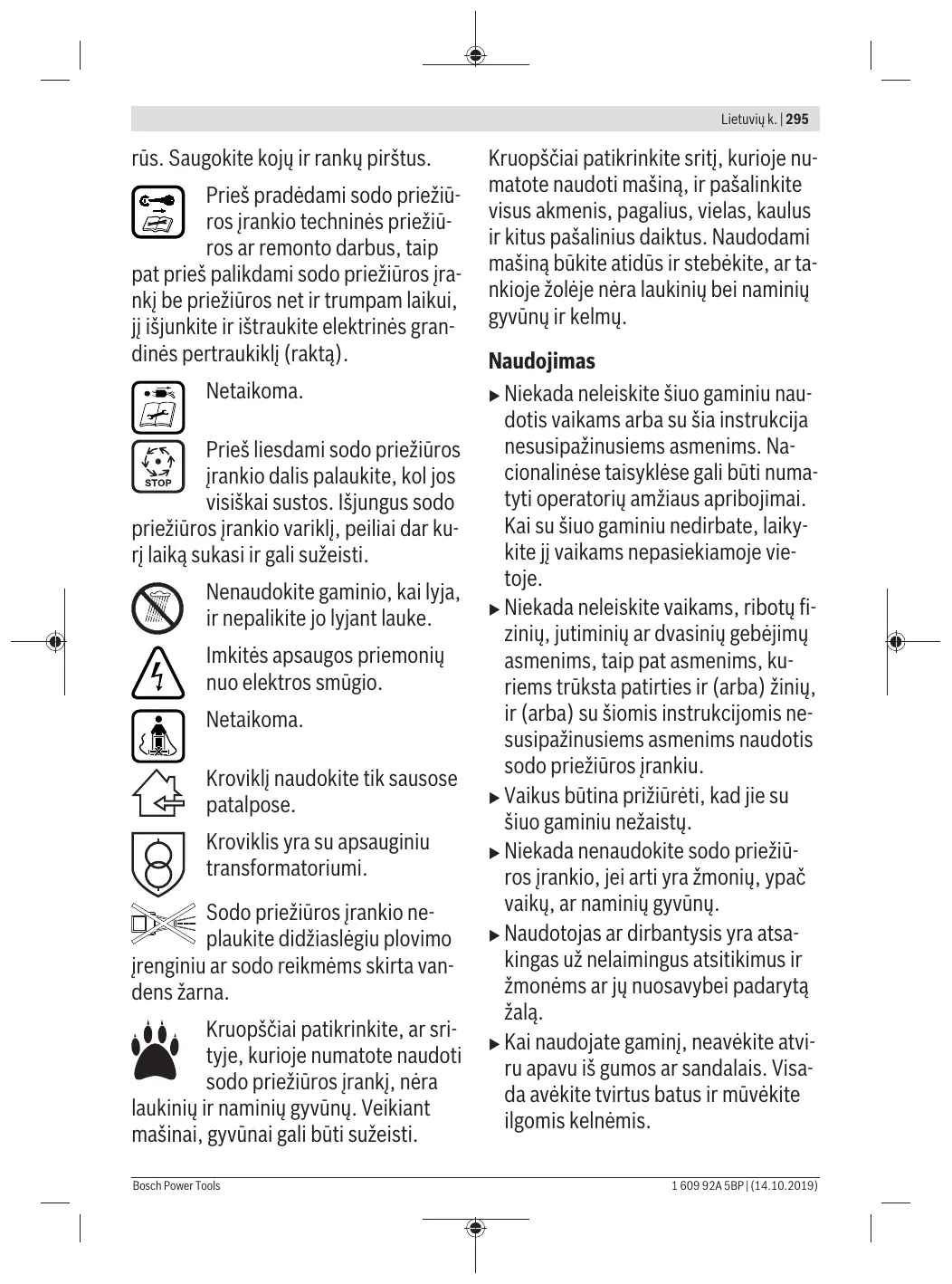 rūs. Saugokite kojų ir rankų pirštus. Prieš pradėdami sodo priežiūros įrankio techninės priežiūros ar remonto darbus, taip pat prieš palikdami sodo priežiūros įrankį be priežiūros net ir trumpam laikui, jį išjunkite ir ištraukite elektrinės grandinės pertraukiklį (raktą). Netaikoma. Prieš liesdami sodo priežiūros įrankio dalis palaukite, kol jos visiškai sustos. Išjungus sodo priežiūros įrankio variklį, peiliai dar kurį laiką sukasi ir gali sužeisti. Nenaudokite gaminio, kai lyja, ir nepalikite jo lyjant lauke. Imkitės apsaugos priemonių nuo elektros smūgio. Netaikoma. Kroviklį naudokite tik sausose patalpose. Kroviklis yra su apsauginiu transformatoriumi. Sodo priežiūros įrankio neplaukite didžiaslėgiu plovimo įrenginiu ar sodo reikmėms skirta vandens žarna. Kruopščiai patikrinkite, ar srityje, kurioje numatote naudoti sodo priežiūros įrankį, nėra laukinių ir naminių gyvūnų. Veikiant mašinai, gyvūnai gali būti sužeisti. Bosch Power Tools