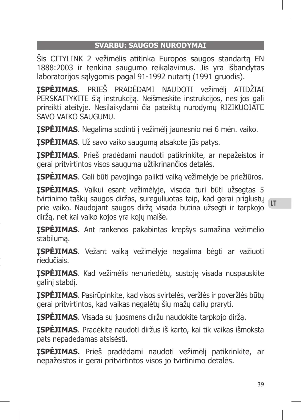 AVERTISSEMENT: Vous êtes responsable de la sécurité de votre enfant. FR AVERTISSEMENT: S’assurer que tous les dispositifs de verrouillage sont correctement enclenchés avant utilisation. AVERTISSEMENT: Il peut être dangereux de laisser votre enfant sans surveillance. AVERTISSEMENT: En toutes circonstances, attachez l’enfant avec le harnais de sécurité à 5 points ajusté à sa taille lorsque vous utilisez la poussette. Toujours utiliser la sangle de l’entrejambe avec le harnais de sécurité, même si vous utilisez une chancelière. AVERTISSEMENT: Le fait d’accrocher au poussoir une charge influe sur la stabilité de la poussette / du landau. AVERTISSEMENT: Ne pas utiliser ce produit en faisant du jogging ou des promenades en rollers. AVERTISSEMENT: Utilisez toujours le frein arrière au pied pour immobiliser la poussette. AVERTISSEMENT: Vous devez veiller à ce que les molettes et les bouchons des valves soient fermement vissés sur les roues pour éviter tout risque dû à la présence de petits éléments susceptibles d’être ingérés. AVERTISSEMENT: Ne jamais utiliser l’entrejambe sans la ceinture de maintien. AVERTISSEMENT: Utilisez un harnais dès que l’enfant peut tenir assis tout seul. 27
