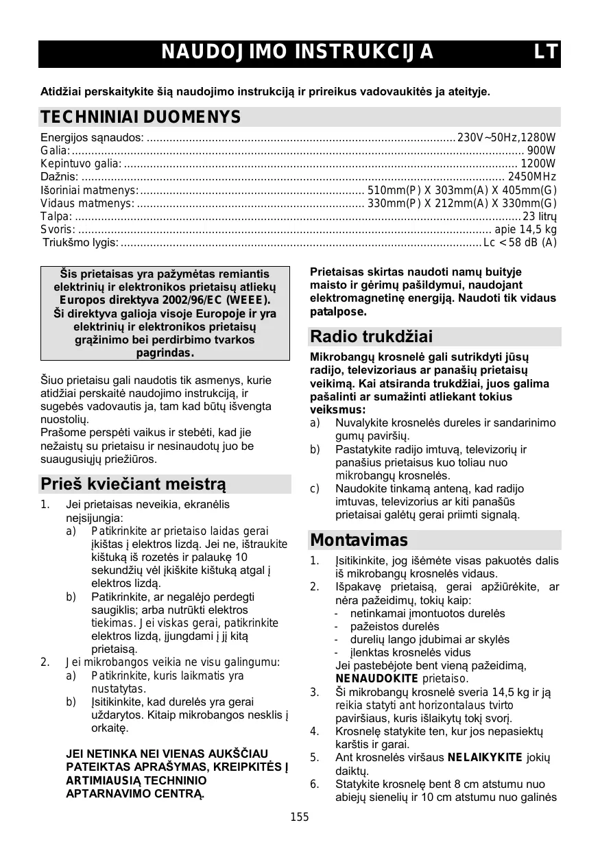 Atidņiai perskaitykite ńią naudojimo instrukciją ir prireikus vadovaukitės ja ateityje. TECHNINIAI DUOMENYS Energijos sąnaudos: ............................................................................................... 230V~50Hz,1280W Galia: ........................................................................................................................................... 900W Kepintuvo galia: ......................................................................................................................... 1200W Daņnis: .................................................................................................................................. 2450MHz Ińoriniai matmenys: ..................................................................... 510mm(P) X 303mm(A) X 405mm(G) Vidaus matmenys: ...................................................................... 330mm(P) X 212mm(A) X 330mm(G) Talpa: ......................................................................................................................................... 23 litrų Svoris: ............................................................................................................................... apie 14,5 kg Triukńmo lygis: ............................................................................................................... Lc < 58 dB (A) Prietaisas skirtas naudoti namų buityje maisto ir gėrimų pańildymui, naudojant elektromagnetinę energiją. Naudoti tik vidaus patalpose. Ńis prietaisas yra paņymėtas remiantis elektrinių ir elektronikos prietaisų atliekų Europos direktyva 2002/96/EC (WEEE). Ńi direktyva galioja visoje Europoje ir yra elektrinių ir elektronikos prietaisų grąņinimo bei perdirbimo tvarkos pagrindas. Radio trukdņiai Mikrobangų krosnelė gali sutrikdyti jūsų radijo, televizoriaus ar panańių prietaisų veikimą. Kai atsiranda trukdņiai, juos galima pańalinti ar sumaņinti atliekant tokius veiksmus: a) Nuvalykite krosnelės dureles ir sandarinimo gumų pavirńių. b) Pastatykite radijo imtuvą, televizorių ir panańius prietaisus kuo toliau nuo mikrobangų krosnelės. c) Naudokite tinkamą anteną, kad radijo imtuvas, televizorius ar kiti panańūs prietaisai galėtų gerai priimti signalą. Ńiuo prietaisu gali naudotis tik asmenys, kurie atidņiai perskaitė naudojimo instrukciją, ir sugebės vadovautis ja, tam kad būtų ińvengta nuostolių. Prańome perspėti vaikus ir stebėti, kad jie neņaistų su prietaisu ir nesinaudotų juo be suaugusiųjų prieņiūros. Prień kvieĉiant meistrą