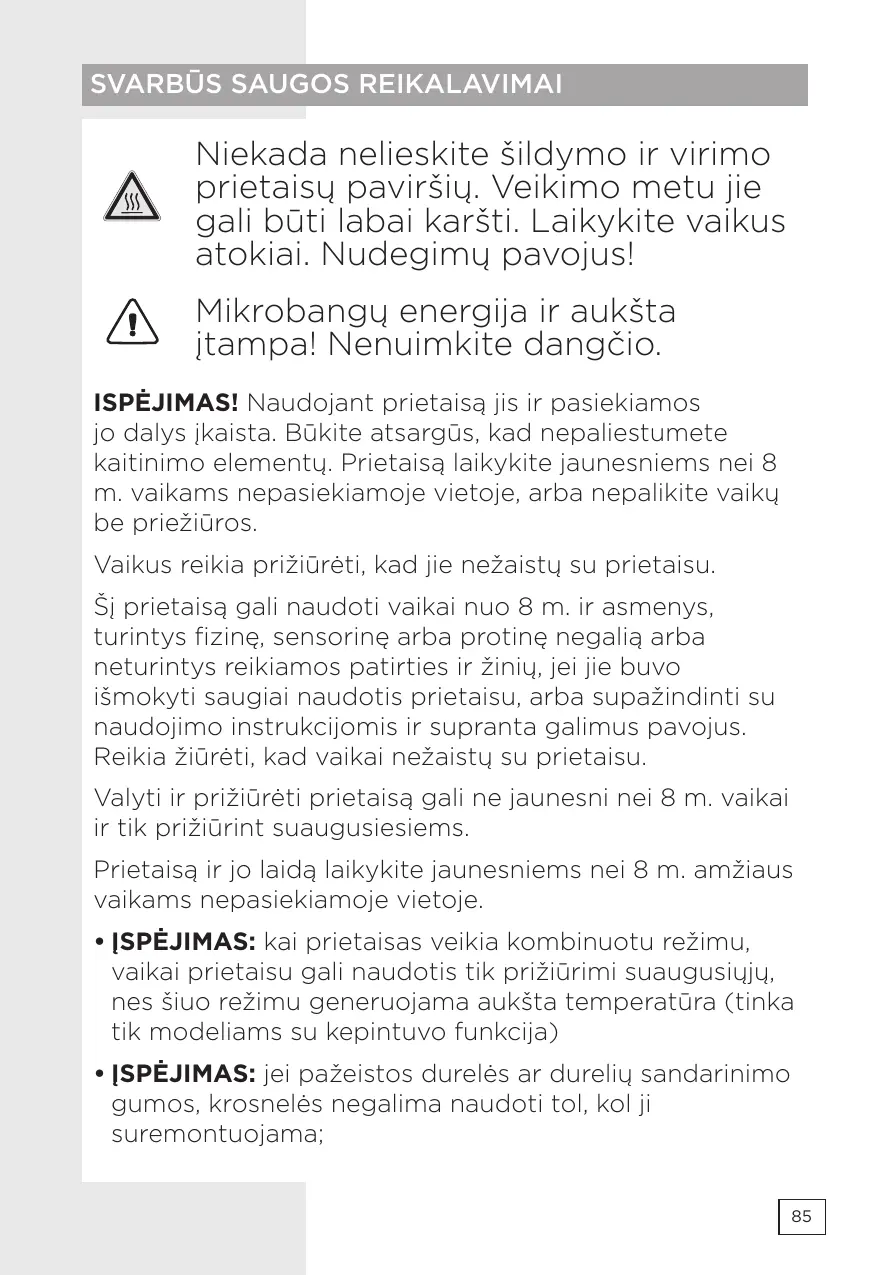 Niekada nelieskite šildymo ir virimo prietaisų paviršių. Veikimo metu jie gali būti labai karšti. Laikykite vaikus atokiai. Nudegimų pavojus! Mikrobangų energija ir aukšta įtampa! Nenuimkite dangčio. ISPĖJIMAS! Naudojant prietaisą jis ir pasiekiamos jo dalys įkaista. Būkite atsargūs, kad nepaliestumete kaitinimo elementų. Prietaisą laikykite jaunesniems nei 8 m. vaikams nepasiekiamoje vietoje, arba nepalikite vaikų be priežiūros. Vaikus reikia prižiūrėti, kad jie nežaistų su prietaisu. Šį prietaisą gali naudoti vaikai nuo 8 m. ir asmenys, turintys fizinę, sensorinę arba protinę negalią arba neturintys reikiamos patirties ir žinių, jei jie buvo išmokyti saugiai naudotis prietaisu, arba supažindinti su naudojimo instrukcijomis ir supranta galimus pavojus. Reikia žiūrėti, kad vaikai nežaistų su prietaisu. Valyti ir prižiūrėti prietaisą gali ne jaunesni nei 8 m. vaikai ir tik prižiūrint suaugusiesiems. Prietaisą ir jo laidą laikykite jaunesniems nei 8 m. amžiaus vaikams nepasiekiamoje vietoje.