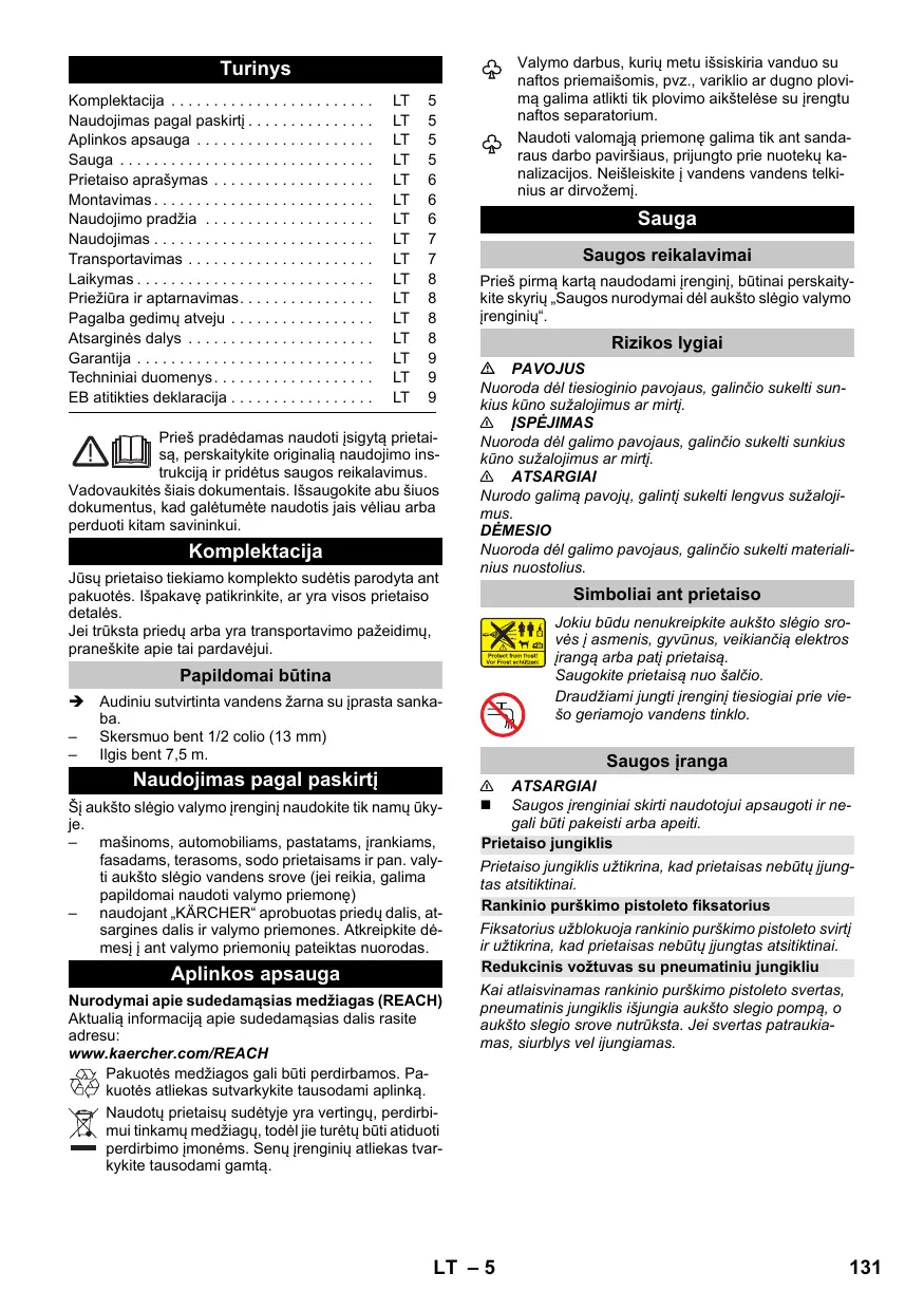 EN 60335–2–79 EN 61000–3–2: 2006+A1: 2009+A2: 2009 EN 61000–3–3: 2013 EN 62233: 2008 Procedimiento de evaluación de la conformidad aplicado 2000/14/CE: Anexo V Nivel de potencia acústica dB(A) Medido: 87 Garantizado: à rede 5 Local de armazenamento para mangueira de alta pressão 6 Alça de transporte 7 Conexão de água com peneira incorporada 8 Mangueira de aspiração do detergente com filtro de detergente e tampa 9 Reservatório de detergente 10 Peça de acoplamento para ligação da água 11 Local de armazenamento para lança 12 Local de armazenamento da pistola pulverizadora manual 13 Cabo de ligação à rede com ficha de rede 14 Roda de transporte 15 Pistola de injecção manual 16 Bloqueio da pistola pulverizadora manual 17 Botão para separar a mangueira de alta pressão da pistola pulverizadora manual 18 Mangueira de alta pressão EN 60335–1 EN 60335–2–79 EN 61000–3–2: 2006+A1: 2009+A2: 2009 EN 61000–3–3: 2013 EN 62233: 2008 Processo aplicado de avaliação de conformidade 2000/14/CE: Anexo V Nível de potência acústica dB(A) Medido: 87 EN 60335–1 EN 60335–2–79 EN 61000–3–2: 2006+A1: 2009+A2: 2009 EN 61000–3–3: 2013 EN 62233: 2008 Anvendte overensstemmelsesvurderingsprocedurer 2000/14/EF: Bilag V Lydeffektniveau dB(A) Målt: EN 60335–1 EN 60335–2–79 EN 61000–3–2: 2006+A1: 2009+A2: 2009 EN 61000–3–3: 2013 EN 62233: 2008 Anvendt metode for samsvarsvurdering 2000/14/EF: Vedlegg V Lydeffektnivå dB(A) Målt: EN 60335–1 EN 60335–2–79 EN 61000–3–2: 2006+A1: 2009+A2: 2009 EN 61000–3–3: 2013 EN 62233: 2008 Tillämpad metod för överensstämmelsevärdering 2000/14/EG: Bilaga V Ljudeffektsnivå dB(A) Upmätt: EN 60335–1 EN 60335–2–79 EN 61000–3–2: 2006+A1: 2009+A2: 2009 EN 61000–3–3: 2013 EN 62233: 2008 Sovellettu yhdenmukaisuuden analysointimenetelmä 2000/14/EY: Liite V Äänen tehotaso dB(A) EN 60335–1 EN 60335–2–79 EN 61000–3–2: 2006+A1: 2009+A2: 2009 EN 61000–3–3: 2013 EN 62233: 2008 Εφαρμοσθείσα διαδικασία συμμόρφωσης 2000/14/EΚ: Παράρτημα V στάθμη ηχητικής πίεσης dB(A) EN 60335–1 EN 60335–2–79 EN 61000–3–2: 2006+A1: 2009+A2: 2009 EN 61000–3–3: 2013 EN 62233: 2008 Kullanılan uyumluluk değerlendirme yöntemleri 2000/14/EG: Ek V Ses şiddeti dB(A) Ölçülen: 87 EN 60335–1 EN 60335–2–79 EN 61000–3–2: 2006+A1: 2009+A2: 2009 EN 61000–3–3: 2013 EN 62233: 2008 Примененный порядок оценки соответствия 2000/14/ЕС: Приложение V Уровень мощности звука dB(A) EN 60335–1 EN 60335–2–79 EN 61000–3–2: 2006+A1: 2009+A2: 2009 EN 61000–3–3: 2013 EN 62233: 2008 Követett megfelelés megállapítási eljárás: 2000/14/EK: V. függelék Hangteljesítményszint dB(A) EN 60335–1 EN 60335–2–79 EN 61000–3–2: 2006+A1: 2009+A2: 2009 EN 61000–3–3: 2013 EN 62233: 2008 Použitý postup posuzování shody: 2000/14/ES: Příloha V Hladinu akustického dB(A) Namerenou: EN 60335–1 EN 60335–2–79 EN 61000–3–2: 2006+A1: 2009+A2: 2009 EN 61000–3–3: 2013 EN 62233: 2008 Postopek ocenjevanja skladnosti: 2000/14/ES: Priloga V Raven zvočne moči dB(A) Izmerjeno: EN 60335–1 EN 60335–2–79 EN 61000–3–2: 2006+A1: 2009+A2: 2009 EN 61000–3–3: 2013 EN 62233: 2008 Zastosowana metoda oceny zgodności 2000/14/WE: Załącznik V Poziom mocy akustycznej dB(A) Zmierzony: Trepte de pericol  PERICOL Indicaţie referitoare la un pericol iminent, care duce la vătămări corporale grave sau moarte. 몇 AVERTIZARE Indicaţie referitoare la o posibilă situaţie periculoasă, care ar putea duce la vătămări corporale grave sau moarte. 몇 PRECAUŢIE Indică o posibilă situaţie periculoasă, care ar putea duce la vătămări corporale uşoare. ATENŢIE Indicaţie referitoare la o posibilă situaţie periculoasă, care ar putea duce la pagube materiale. 14 Roată de transport 15 Pistol de pulverizare 16 Zăvor pistol de pulverizat 17 Buton de detaşare a furtunului de înaltă presiune de pistolul de pulverizat 18 Furtun de înaltă presiune 19 Lance cu reglaj de presiune (Vario Power) Pentru lucrările de curăţare uzuale. Presiunea de lucru poate fi reglată fără trepte între „Min” şi „Max”. În poziţia „Min” puteţi adăuga soluţia de curăţat. Pentru reglarea presiunii de lucru, eliberaţi maneta pistolului manual de stropit şi rotiţi lancea în poziţia dorită. şi se spală sub jet de apă.  Evacuarea aerului din aparat: Porniţi aparatul cu furtunul de înaltă presiune deconectat şi lăsaţi-l să funcţioneze (max. 2 min.), până ce apa iese pe ieşirea de înaltă presiune fără a conţine bule de aer. Opriţi aparatul şi racordaţi furtunul de înaltă presiune.