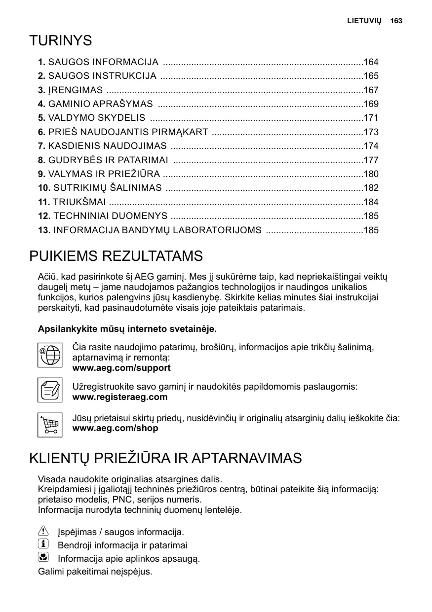 PUIKIEMS REZULTATAMS Ačiū, kad pasirinkote šį AEG gaminį. Mes jį sukūrėme taip, kad nepriekaištingai veiktų daugelį metų – jame naudojamos pažangios technologijos ir naudingos unikalios funkcijos, kurios palengvins jūsų kasdienybę. Skirkite kelias minutes šiai instrukcijai perskaityti, kad pasinaudotumėte visais joje pateiktais patarimais. Apsilankykite mūsų interneto svetainėje. Čia rasite naudojimo patarimų, brošiūrų, informacijos apie trikčių šalinimą, aptarnavimą ir remontą: www.aeg.com/support Užregistruokite savo gaminį ir naudokitės papildomomis paslaugomis: www.registeraeg.com Jūsų prietaisui skirtų priedų, nusidėvinčių ir originalių atsarginių dalių ieškokite čia: www.aeg.com/shop