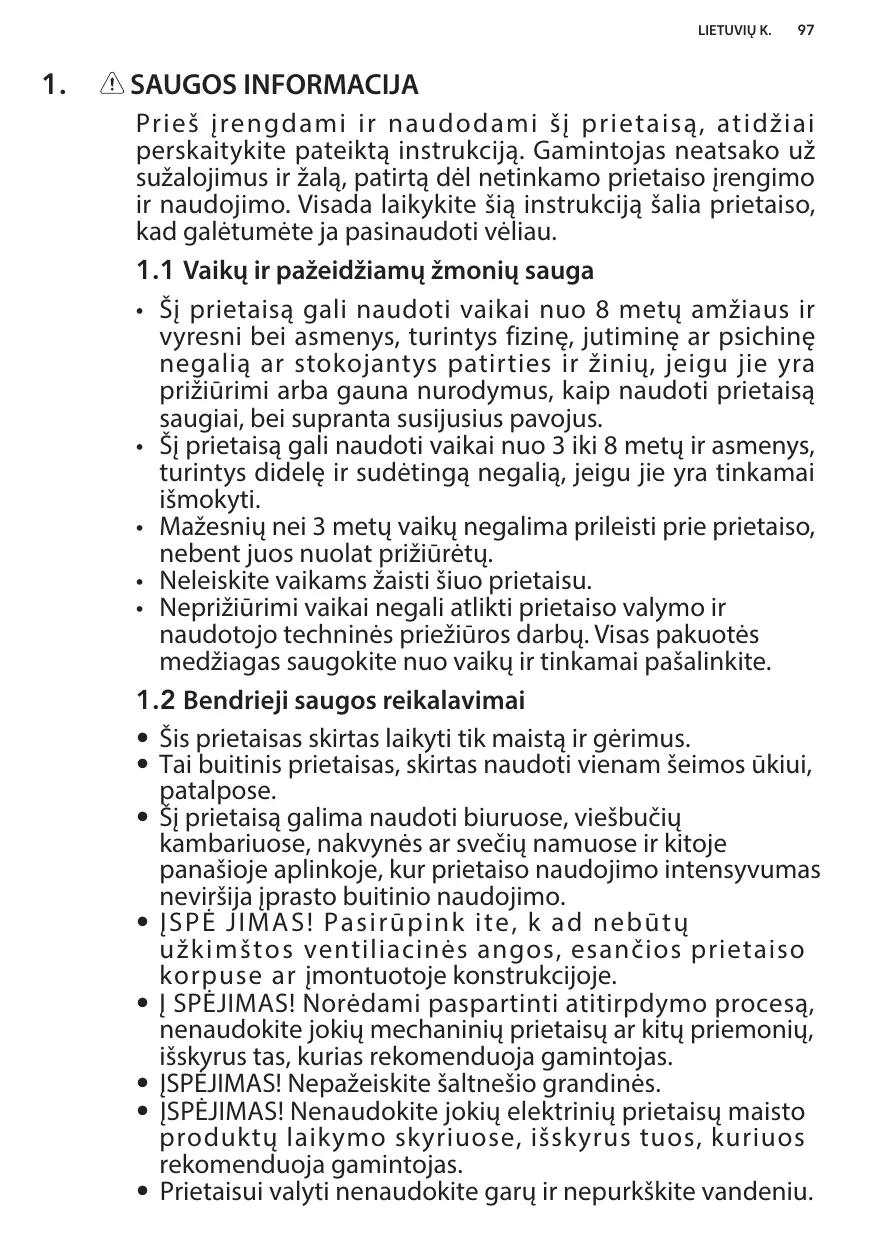 • Š į prietaisą gali naudoti vaikai nuo 8 metų amžiaus ir vyresni bei asmenys, turintys fizinę, jutiminę ar psichinę negalią ar stokojantys patirties ir žinių, jeigu jie yra prižiūrimi arba gauna nurodymus, kaip naudoti prietaisą saugiai, bei supranta susijusius pavojus.