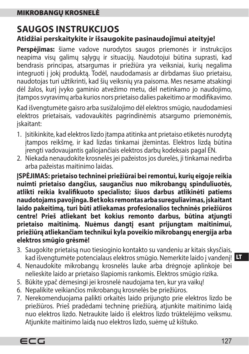 JSPÉJIMAS: prietaiso techninei priežiūrai bei remontui, kuriç eigoje reikia nuimti prietaiso dangčius, saugancius nuo mikrobangu spinduliuotès, atlikti reikia kvalifikuoto specialisto; šiuos darbus atlikinétī patiens naudotojams pavojinga. Bet koks remontas arba sureguliavimas, jskaitant laido pakeitima, turi būti atliekamas profesionalios techninés priežiūros centre! Pries atliekant bet kokius remonto darbus, butina atjungti prietaiso maitinimā. Nuemus dangtī esant prijungtam maitinimui, priežiūrā atliekančiam technikui kyla poveikio mikrobangu energia arba elektrós smūgio grèsmé!