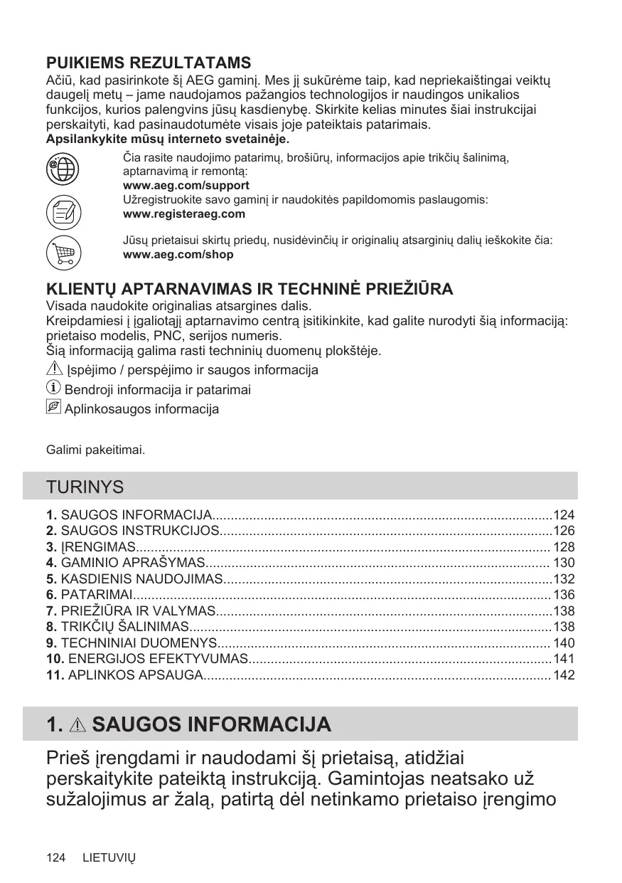 PUIKIEMS REZULTATAMS Ačiū, kad pasirinkote šį AEG gaminį. Mes jį sukūrėme taip, kad nepriekaištingai veiktų daugelį metų – jame naudojamos pažangios technologijos ir naudingos unikalios funkcijos, kurios palengvins jūsų kasdienybę. Skirkite kelias minutes šiai instrukcijai perskaityti, kad pasinaudotumėte visais joje pateiktais patarimais. Apsilankykite mūsų interneto svetainėje. Čia rasite naudojimo patarimų, brošiūrų, informacijos apie trikčių šalinimą, aptarnavimą ir remontą: www.aeg.com/support Užregistruokite savo gaminį ir naudokitės papildomomis paslaugomis: www.registeraeg.com Jūsų prietaisui skirtų priedų, nusidėvinčių ir originalių atsarginių dalių ieškokite čia: www.aeg.com/shop KLIENTŲ APTARNAVIMAS IR TECHNINĖ PRIEŽIŪRA Visada naudokite originalias atsargines dalis. Kreipdamiesi į įgaliotąjį aptarnavimo centrą įsitikinkite, kad galite nurodyti šią informaciją: prietaiso modelis, PNC, serijos numeris. Šią informaciją galima rasti techninių duomenų plokštėje. Įspėjimo / perspėjimo ir saugos informacija Bendroji informacija ir patarimai Aplinkosaugos informacija Galimi pakeitimai. TURINYS
