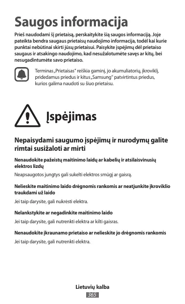 Neleiskite, kad įkroviklyje ar prietaise įvyktų trumpasis jungimas Jei taip darysite, gali nutrenkti elektra ar kilti gaisras arba akumuliatorius gali pradėti veikti netinkamai ar susprogti. Nenaudokite prietaiso perkūnijos metu lauke Jei taip darysite, gali nutrenkti elektra arba prietaisas gali pradėti veikti netinkamai. Naudokitės tik gamintojo patvirtintais akumuliatoriais, įkrovikliais, priedais ir resursais • Naudodami ne originalius akumuliatorius ar įkroviklius galite sutrumpinti naudojimosi prietaisu laiką arba prietaisas gali pradėti veikti netinkamai. Tai taip pat gali sukelti gaisrą ar akumuliatoriaus sprogimą. • Naudokitės tik „Samsung“ patvirtintais akumuliatoriais ir įkrovikliais, skirtais jūsų prietaisui. Nesuderinamas akumuliatorius ir įkroviklis gali rimtai sužaloti jus ar sugadinti prietaisą. • „Samsung“ negali būti atsakinga už naudotojo saugumą naudojant „Samsung“ neaprobuotus priedus. Nenešiokite prietaiso galinėse kišenėse arba ant juosmens • Pernelyg spaudžiamas prietaisas gali būti sugadintas, sprogti arba užsidegti. • Į ką nors atsitrenkę arba pargriuvę galite susižeisti. Neišmeskite įkroviklio ar prietaiso ir apsaugokite jį nuo smūgių Su prietaisu ir įkrovikliu elkitės ir jį išmeskite atsargiai • Niekada nemeskite akumuliatoriaus ar prietaiso į ugnį. Niekada nedėkite akumuliatoriaus ar prietaiso ant šildymo prietaisų ar į juos, pavyzdžiui, į mikrobangų krosnelę, ant viryklės ar radiatorių. Perkaitintas prietaisas gali susprogti. Išmesdami panaudotą akumuliatorių ar prietaisą vadovaukitės vietiniais reglamentais. • Niekada nespauskite ir nepradurkite prietaiso. • Venkite naudoti prietaisą, kai yra aukštas išorės slėgis, nes tai gali sukelti vidinį trumpąjį jungimą ir perkaitimą.