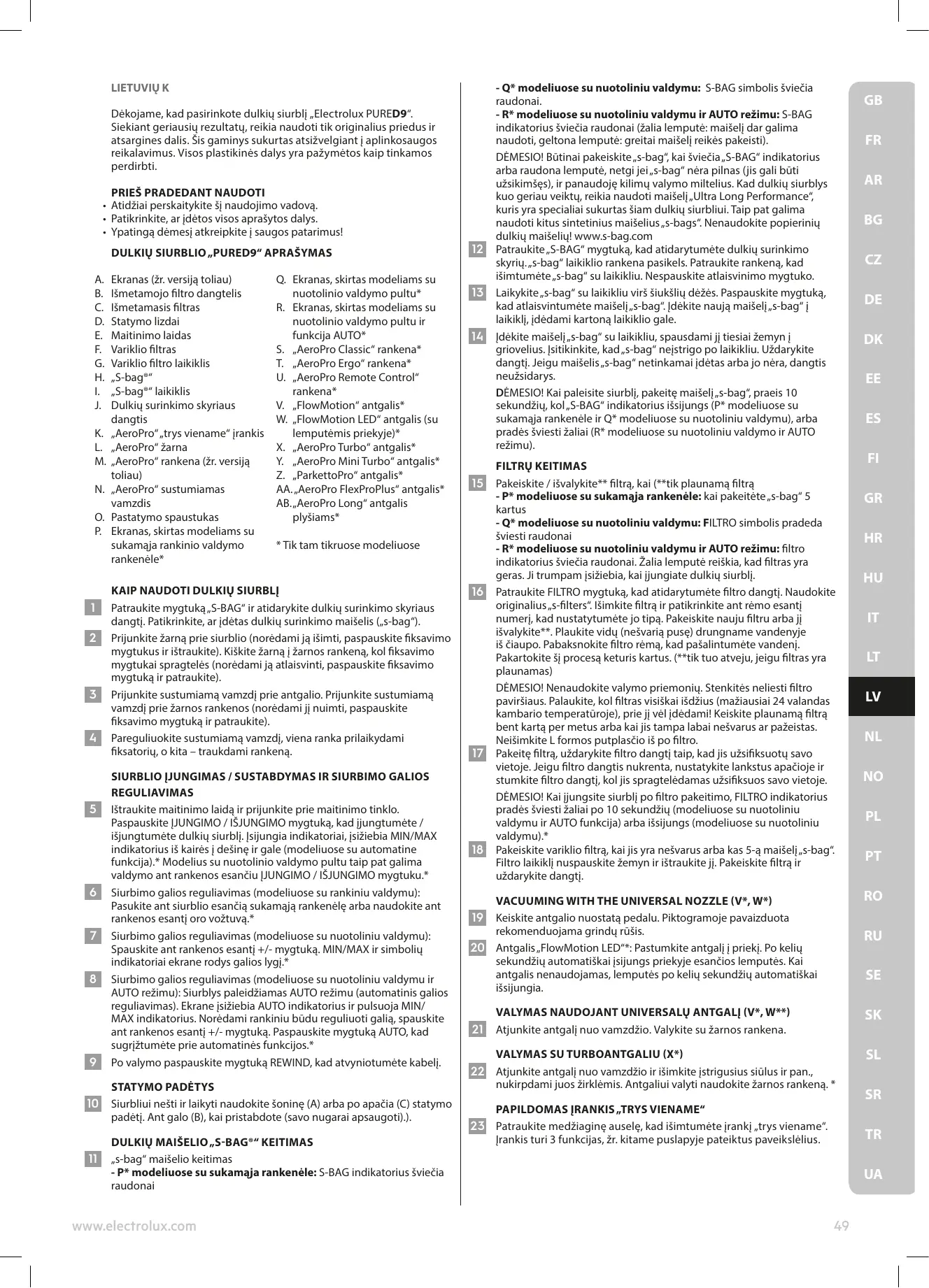 LIETUVIŲ K Dėkojame, kad pasirinkote dulkių siurblį „Electrolux PURED9“. Siekiant geriausių rezultatų, reikia naudoti tik originalius priedus ir atsargines dalis. Šis gaminys sukurtas atsižvelgiant į aplinkosaugos reikalavimus. Visos plastikinės dalys yra pažymėtos kaip tinkamos perdirbti.