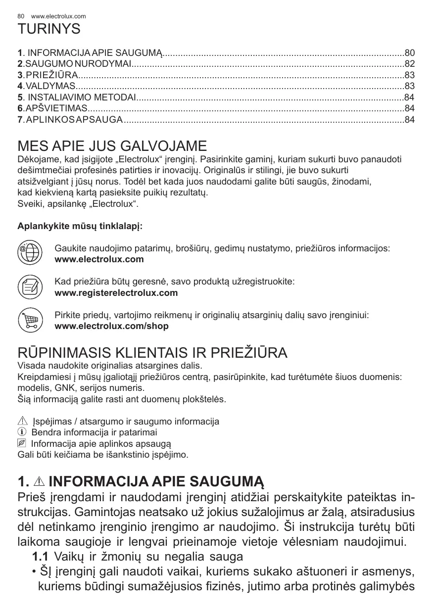 Dėkojame, kad įsigijote „Electrolux“ įrenginį. Pasirinkite gaminį, kuriam sukurti buvo panaudoti dešimtmečiai profesinės patirties ir inovacijų. Originalūs ir stilingi, jie buvo sukurti atsižvelgiant į jūsų norus. Todėl bet kada juos naudodami galite būti saugūs, žinodami, kad kiekvieną kartą pasieksite puikių rezultatų. Sveiki, apsilankę „Electrolux“. Aplankykite mūsų tinklalapį: Gaukite naudojimo patarimų, brošiūrų, gedimų nustatymo, priežiūros informacijos: www.electrolux.com Kad priežiūra būtų geresnė, savo produktą užregistruokite: www.registerelectrolux.com Pirkite priedų, vartojimo reikmenų ir originalių atsarginių dalių savo įrenginiui: www.electrolux.com/shop RŪPINIMASIS KLIENTAIS IR PRIEŽIŪRA Visada naudokite originalias atsargines dalis. Kreipdamiesi į mūsų įgaliotąjį priežiūros centrą, pasirūpinkite, kad turėtumėte šiuos duomenis: modelis, GNK, serijos numeris. Šią informaciją galite rasti ant duomenų plokštelės. Įspėjimas / atsargumo ir saugumo informacija Bendra informacija ir patarimai Informacija apie aplinkos apsaugą Gali būti keičiama be išankstinio įspėjimo.