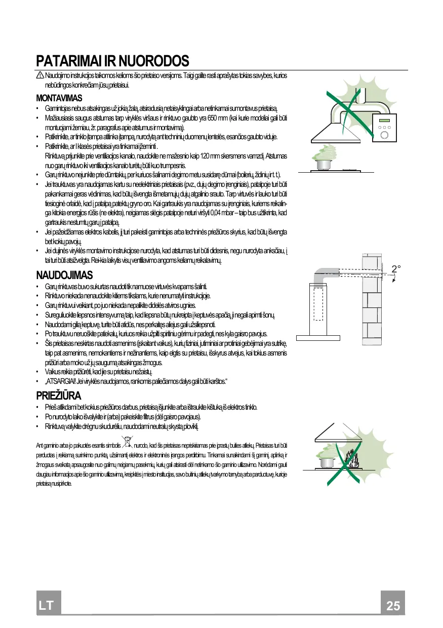Garų rinktuvas buvo sukurtas naudoti tik namuose virtuvės kvapams šalinti. Rinktuvo niekada nenaudokite kitiems tikslams, kurie nenumatyti instrukcijoje. Garų rinktuvui veikiant, po juo niekada nepalikite didelės atviros ugnies. Sureguliuokite liepsnos intensyvumą taip, kad liepsna būtų nukreipta į keptuvės apačią, ji negali apimti šonų. Naudodami gilią keptuvę, turite būti atidūs, nes perkaitęs aliejus gali užsiliepsnoti. Po trauktuvu neruoškite patiekalų, kuriuos reikia užpilti spiritiniu gėrimu ir padegti, nes kyla gaisro pavojus. Šis prietaisas neskirtas naudoti asmenims (įskaitant vaikus), kurių fiziniai, jutiminiai ar protiniai gebėjimai yra sutrikę, taip pat asmenims, nemokantiems ir nežinantiems, kaip elgtis su prietaisu, išskyrus atvejus, kai tokius asmenis prižiūri arba moko už jų saugumą atsakingas žmogus. • Vaikus reikia prižiūrėti, kad jie su prietaisu nežaistų. • „ATSARGIAI! Jei viryklės naudojamos, rankomis paliečiamos dalys gali būti karštos.“