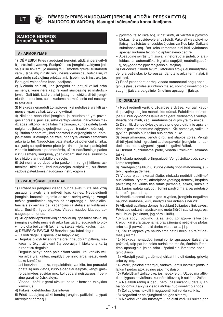 Jei yra pažeistas jo korpusas, dangtelis arba terminalai, jį pakeisti. 7) Prieš pradedant darbą, visada sumontuoti angų apsauginius įtaisus (žolės surinkimo maišo, šoninio išmetimo apsauginį įtaisą arba galinio išmetimo apsauginį įtaisą). C) DIRBANT 1) Neužvedinėti variklio uždarose erdvėse, kur gali kauptis pavojingi anglies monoksido dūmai. Paleidimo operacijos turi būti vykdomos lauke arba gerai vėdinamoje vietoje. Visada prisiminti, kad išmetamosios dujos yra toksiškos.