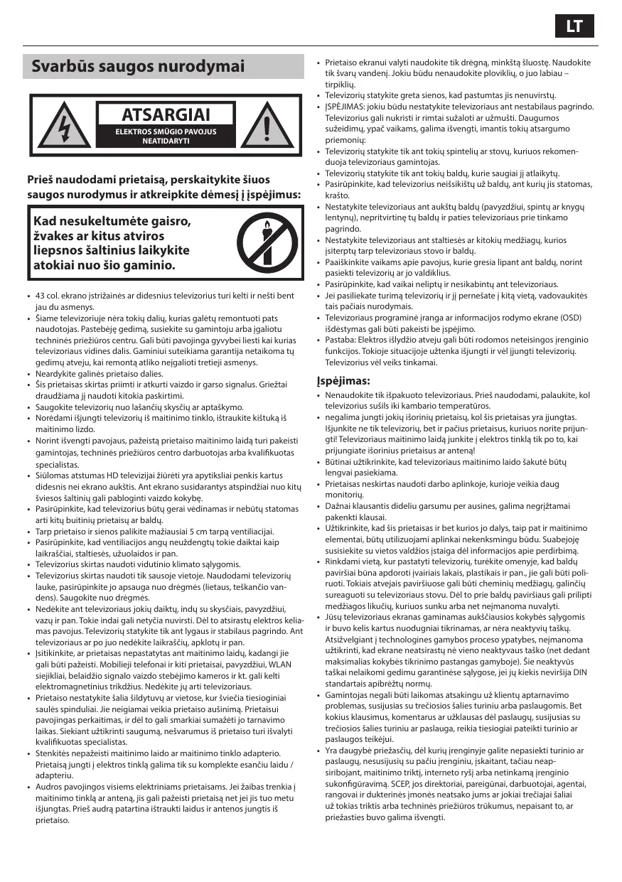 Idioma - permite cambiar el idioma del menú. Proporciona información sobre programas próximos (cuando lo admite el canal digital). Puede ver la hora de inicio y la hora de finalización de todos los programas y en todos los canales durante los próximos 7 días y establecer recordatorios. 1. Pulse [TV GUIDE]. Aparecerá la guía de televisión de los siguientes 7 días. 2. Navegue a través del menú utilizando ▲/▼/◄/►. Ahora puede: recordatorio pulsando el botón VERDE. ū VGA/PC* - pilt on ilma liighälvituseta. Valige see valik käsitsi, kui osa ekraanist on pärast arvuti teleriga ühendamist peidetud. Arvuti* éloignées de ce produit. • Les télévisions avec écran de 43" ou plus doivent être soulevées et portées par au moins deux personnes. • Cette TV ne contient aucune pièce qui pourrait être réparée par l'utilisateur. En cas de défaut, contacter le fabricant ou l'agent autorisé qui assure le service après-vente. Le contact avec certaines parties situées à l'intérieur de la TV pourrait mettre votre vie en danger. La garantie ne couvre pas les défauts provoqués par des réparations effectuées par des tiers non autorisés. • Ne pas enlever la partie arrière de l'appareil. • Cet appareil est conçu pour la réception et la reproduction des signaux vidéos et sonores. Toute autre utilisation est interdite. • Ne pas exposer la TV aux égouttures ou éclaboussures de liquides. • Pour déconnecter la télévision de l’alimentation électrique, veuillez débrancher la fiche de la prise d’alimentation. • Si le cordon d'alimentation est endommagé, il doit être remplacé par le fabricant, un agent du service après-vente ou des personnes de qualifications similaires afin d'éviter un risque. • La distance conseillée pour regarder la TV HD est d'environ 5 fois la hauteur de l’écran. Les réflexions d'autres sources lumineuses sur l'écran peuvent altérer la qualité de l'image. • S'assurer que la TV dispose d'une ventilation suffisante et qu'elle n'est pas à proximité d'autres appareils et d'autres meubles. • Pour la ventilation, installer le produit à 5 cm du mur au minimum. • S'assurer que les ouvertures de ventilation sont dégagées des articles tels que des journaux, des nappes de table, des rideaux, etc… • La TV est conçue pour être employée sous un climat modéré. • La TV est conçue exclusivement pour une utilisation dans un endroit sec. Quand on utilise la TV à l'extérieur, s'assurer qu'elle est protégée contre l'humidité (pluie, éclaboussures d'eau). Ne jamais exposer la TV à l'humidité. • Ne placez pas d’objets, de récipients remplis de liquide, comme des vases, etc..., sur la télévision. Ces récipients pourraient être renversés, ce qui mettrait en danger la sécurité électrique. Placer la TV exclusivement sur des surfaces plates et stables. Ne placer aucun objet tel qu'un journal ou une couverture, etc. sur ou sous la TV. • S'assurer que l'appareil n'est posé sur aucun câble électrique qui pourrait ainsi être endommagé. Les téléphones mobiles et autres dispositifs tels que les adaptateurs WLAN (Réseau local sans fil), les caméras de surveillance avec transmission sans fil du signal, etc. peuvent causer de l'interférence électromagnétique et ne devraient pas être placés près de l'appareil. • Ne pas placer l'appareil près d'éléments chauffants ou dans un endroit exposé à la lumière directe du soleil cela ayant un effet négatif sur le refroidissement de l'appareil. La chaleur accumulée est dangereuse et