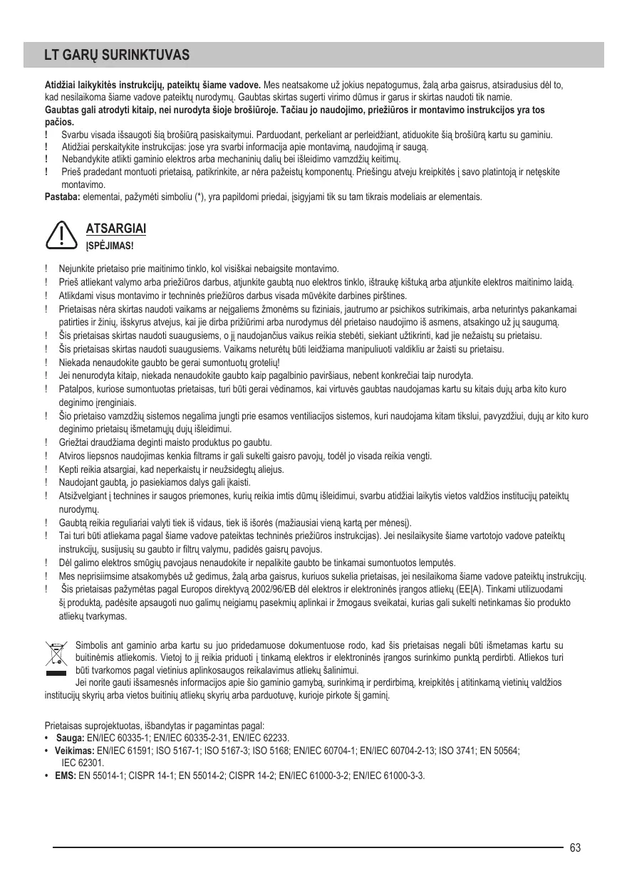 ! Al freír tenga cuidado de que el aceite no se sobrecaliente y se encienda. ! Las partes accesibles de la campana pueden calentarse durante el funcionamiento del aparato de cocina ubicado debajo de la campana. ! En cuanto a las medidas técnicas y de seguridad para la evaporación de vapores, es importante seguir estrictamente las reglas determinadas por las autoridades locales. ! La campana extractora debe limpiarse regularmente tanto desde el interior como desde el exterior (POR LO MENOS UNA VEZ AL MES). ! Limpie la campana extractora de acuerdo con las instrucciones de mantenimiento de este manual. Si no sigue las instrucciones en este manual con respecto a la limpieza de la campana extractora y de los filtros, puede haber riesgo de incendio. ! No utilice la campana extractora o no deje la campana extractora sin la bombilla correctamente instalada, de lo contrario, podría producirse una descarga eléctrica. ! El fabricante se exime de cualquier responsabilidad por defectos, daños o incendios que puedan surgir en el dispositivo debido al incumplimiento de las instrucciones de este manual. ! ! El aparato está marcado de acuerdo con la Directiva Europea 2002/96/CE sobre residuos de equipos eléctricos y electrónicos. Al tener cuidado de eliminar este producto adecuadamente, contribuirá a prevenir los efectos dañinos para el medio ambiente y la salud humana que, de lo contrario, podrían resultar del manejo inadecuado de este producto una vez finalizada su vida útil. El símbolo en el producto o en la documentación adjunta indica que el aparato no debe tratarse como un desecho doméstico, sino que debe entregarse en un punto de recolección adecuado para el reciclaje de equipos eléctricos y electrónicos. Deseche el aparato de acuerdo con las normas ambientales locales para la eliminación de residuos. Para obtener información más detallada sobre la recuperación, recolección y reciclaje de este producto, comuníquese con el departamento correspondiente de la autoridad local competente, el servicio local de gestión de residuos domésticos o la tienda donde adquirió este producto. El aparato está diseñado, probado y fabricado de acuerdo con las siguientes normas o regulaciones: Seguridad: EN/IEC 60335-1; EN/IEC 60335-2-31, EN/IEC 62233. Prestación: EN/IEC 61591; ISO 5167-1; ISO 5167-3; ISO 5168; EN/IEC 60704-1; EN/IEC 60704-2-13; ISO 3741; EN 50564; IEC 62301. En caso de duda, póngase en contacto con un taller de reparación autorizado, un centro de ayuda al cliente u otra persona debidamente cualificada. ¡ADVERTENCIA! Si no instala los tornillos o los accesorios de montaje de acuerdo con estas instrucciones, puede ocurrir un riesgo de descarga eléctrica.