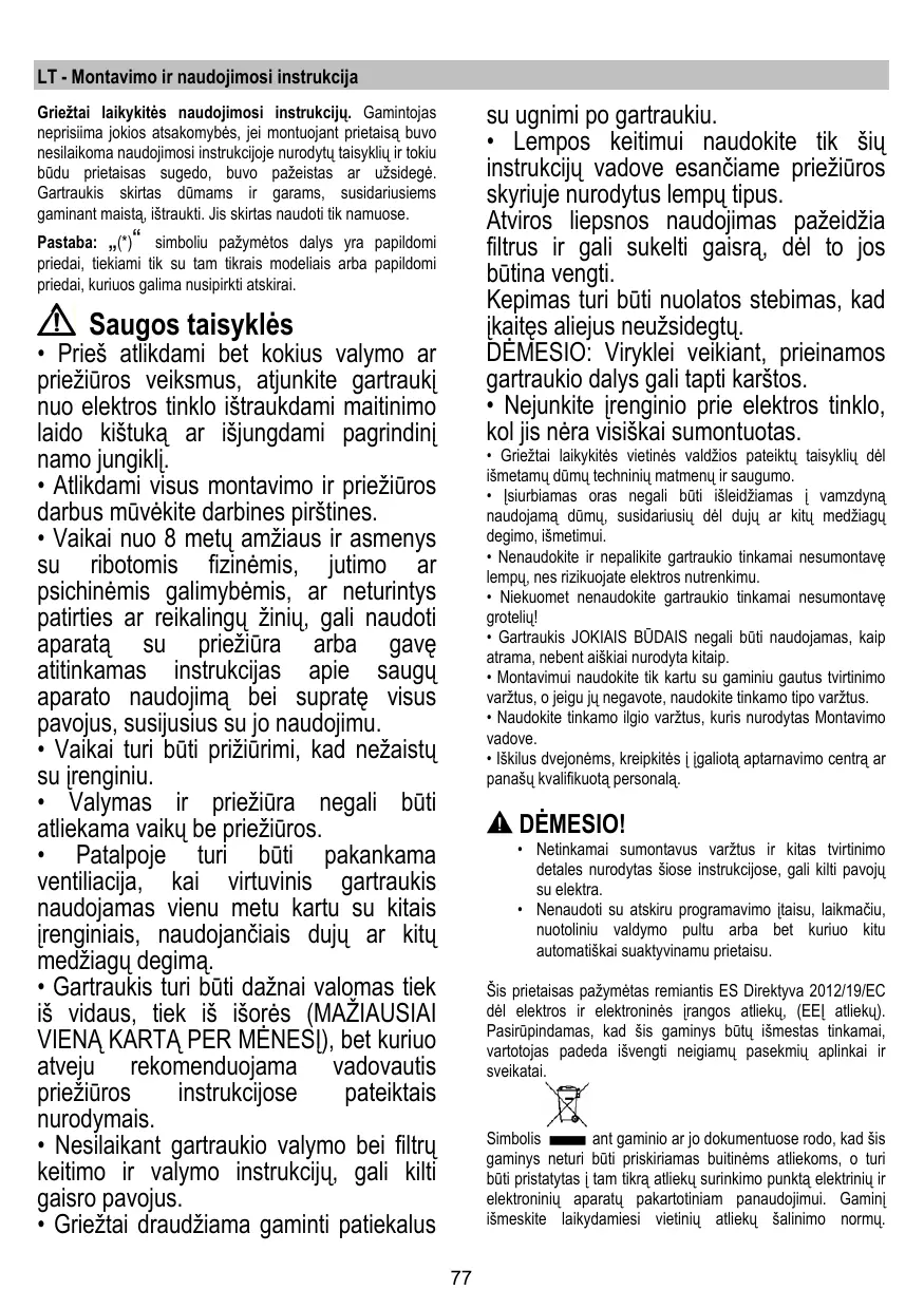 - Patalpoje turi buti pakankama ventiliacija, kai virtuvinis gartraukis naudiojamas vienu metu kartu su kitais irenginiais, naudiojanicais duju ar kitumedziagug degima.