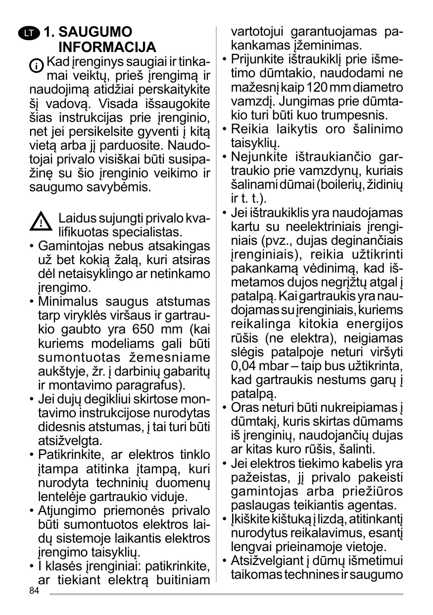 Lesdispositifsdesectionnement doivent être montés dans l’installation fixe conformément aux normes sur les systèmes de câblage. Pour les appareils de Classe I, s’assurer que l’installation électrique de votre intérieur dispose d’une mise à la terre adéquate. Reliez l’aspirateur du conduit de cheminée avec un tube ayant un diamètre minimum de 120 mm. Le parcours des fumées doit être le plus court possible. Respecter toutes les normes concernant l’évacuation de l’air. Ne reliez pas la hotte aspirante aux conduits de cheminée qui acheminent les fumées de combustion (par ex. de chaudières, de cheminées, etc.). Si vous utilisez l’aspirateur en même temps que des appareils non électriques (par ex. fonctionnant au gaz), veillez à ce que la pièce soit adéquatement ventilée, afin d’empêcher le retour du flux des gaz d’évacuation. Si vous utilisez la hotte de cuisine en même temps que des appareils non alimentés à l’électricité, la pression négative dans la pièce ne doit pas dépasser 0,04 mbar, 15