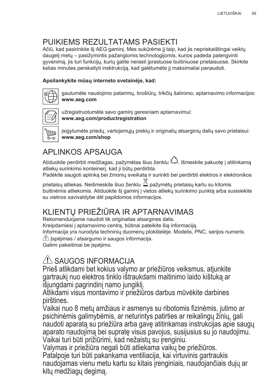 Aciū, kad pasirinkite šj AEG gaminj. Mes sukūrème jj taip, kadjis nepriekaiístingai veiktu daugelj metu - pasižymintis pažangiomis technologijomis, kurios padeda palengvinti gyvenima,jis turi funkciju, kuriu galite nerasti jprastuose buitiniuose prietaisuose. Skirkite kelias minutes perskaityti insktrukcija, kad galetumete jj maksimaliai panaudoti.