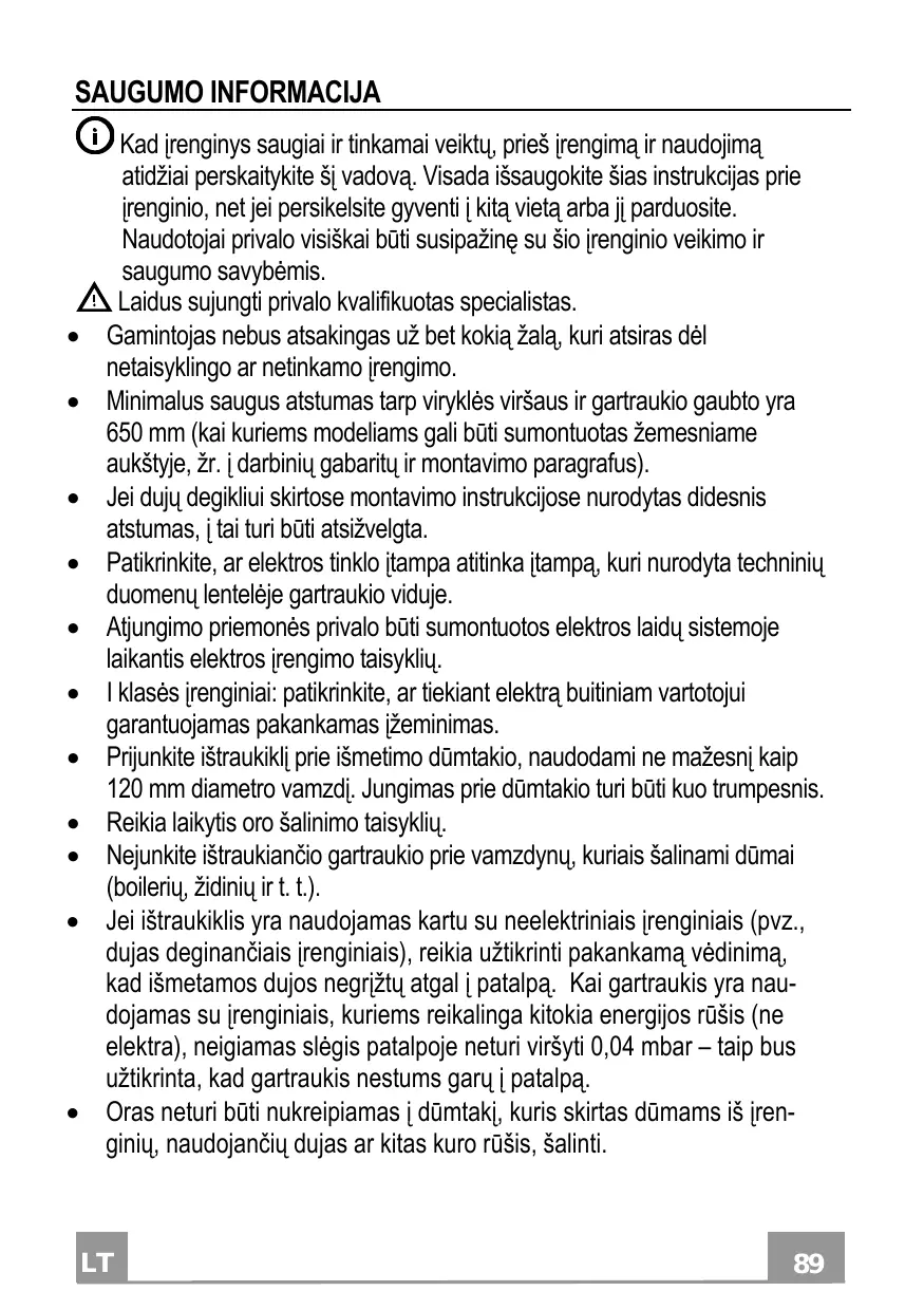 Als de installatievoorschriften van de gaskookplaat bepalen dat een grotere afstand in acht moet worden genomen dan hierboven is aangegeven, dan moet daar rekening mee worden gehouden. Controleer of de netspanning overeenstemt met de spanning die op het typeplaatje aan de binnenkant van de afzuigkap staat vermeld. Er moeten lastscheiders in de vaste installatie worden geïnstalleerd in overeenstemming met de normen over bedradingssystemen. Controleer voor apparaten van klasse I of het elektriciteitsnet in uw woning over een goede aarding beschikt.  Si en las instrucciones de montaje de la placa de cocción a gas se indica una distancia mayor que la indicada anteriormente, debe tenerse en cuenta.  Compruebe que la tensión de red coincide con la indicada en la placa de características del interior de la campana.  Los dispositivos de desconexión deben instalarse en la instalación fija de acuerdo con las regulaciones para sistemas de cableado. Para los aparatos de la clase I, compruebe que el suministro de corriente  eléctrica de la casa tiene una conexión a tierra adecuada.  Conecte la campana a la chimenea con un tubo de un diámetro mínimo de 120 mm. El trayecto de humos debe ser lo más corto posible.  Deben observarse todas las normas relativas al escape de aire.  No conecte la campana extractora a los conductos de humos de combustión (p. ej. calderas, chimeneas, etc.).  Si la campana se utiliza en combinación con equipos no eléctricos (por ejemplo, aparatos de gas), debe asegurarse un grado suficiente de ventilación en el local para evitar el retorno del flujo de gases de escape. Cuando la campana extractora se utiliza en combinación con aparatos no eléctricos, la presión negativa en el local no debe ser superior a 0,04 mbar para evitar que los humos vuelvan al local a través de la campana extractora.  El aire no debe descargarse a través de un conducto utilizado para los gases de combustión procedentes de aparatos de combustión de gas u otros combustibles. ES