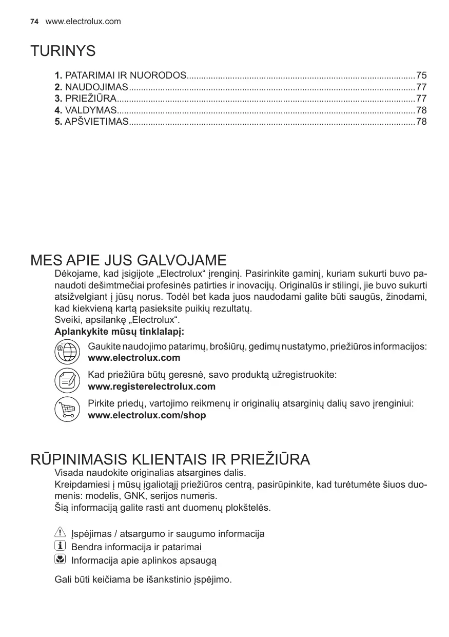 MES APIE JUS GALVOJAME Dėkojame, kad įsigijote „Electrolux“ įrenginį. Pasirinkite gaminį, kuriam sukurti buvo panaudoti dešimtmečiai profesinės patirties ir inovacijų. Originalūs ir stilingi, jie buvo sukurti atsižvelgiant į jūsų norus. Todėl bet kada juos naudodami galite būti saugūs, žinodami, kad kiekvieną kartą pasieksite puikių rezultatų. Sveiki, apsilankę „Electrolux“. Aplankykite mūsų tinklalapį: Gaukite naudojimo patarimų, brošiūrų, gedimų nustatymo, priežiūros informacijos: www.electrolux.com Kad priežiūra būtų geresnė, savo produktą užregistruokite: www.registerelectrolux.com Pirkite priedų, vartojimo reikmenų ir originalių atsarginių dalių savo įrenginiui: www.electrolux.com/shop