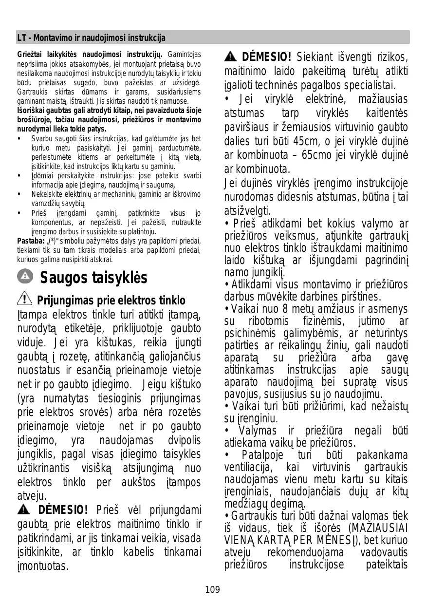 DĖMESIO! Siekiant išvengti rizikos, maitinimo laido pakeitimą turėtų atlikti įgalioti techninės pagalbos specialistai. • Jei viryklė elektrinė, mažiausias atstumas tarp viryklės kaitlentės paviršiaus ir žemiausios virtuvinio gaubto dalies turi būti 45cm, o jei viryklė dujinė ar kombinuota – 65cmo jei viryklė dujinė ar kombinuota. Jei dujinės viryklės įrengimo instrukcijoje nurodomas didesnis atstumas, būtina į tai atsižvelgti. • Prieš atlikdami bet kokius valymo ar priežiūros veiksmus, atjunkite gartraukį nuo elektros tinklo ištraukdami maitinimo laido kištuką ar išjungdami pagrindinį namo jungiklį. • Atlikdami visus montavimo ir priežiūros darbus mūvėkite darbines pirštines. • Vaikai nuo 8 metų amžiaus ir asmenys su ribotomis fizinėmis, jutimo ar psichinėmis galimybėmis, ar neturintys patirties ar reikalingų žinių, gali naudoti aparatą su priežiūra arba gavę atitinkamas instrukcijas apie saugų aparato naudojimą bei supratę visus pavojus, susijusius su jo naudojimu. • Vaikai turi būti prižiūrimi, kad nežaistų su įrenginiu. • Valymas ir priežiūra negali būti atliekama vaikų be priežiūros. • Patalpoje turi būti pakankama ventiliacija, kai virtuvinis gartraukis naudojamas vienu metu kartu su kitais įrenginiais, naudojančiais dujų ar kitų medžiagų degimą. • Gartraukis turi būti dažnai valomas tiek iš vidaus, tiek iš išorės (MAŽIAUSIAI VIENĄ KARTĄ PER MĖNESĮ), bet kuriuo atveju rekomenduojama vadovautis priežiūros instrukcijose pateiktais