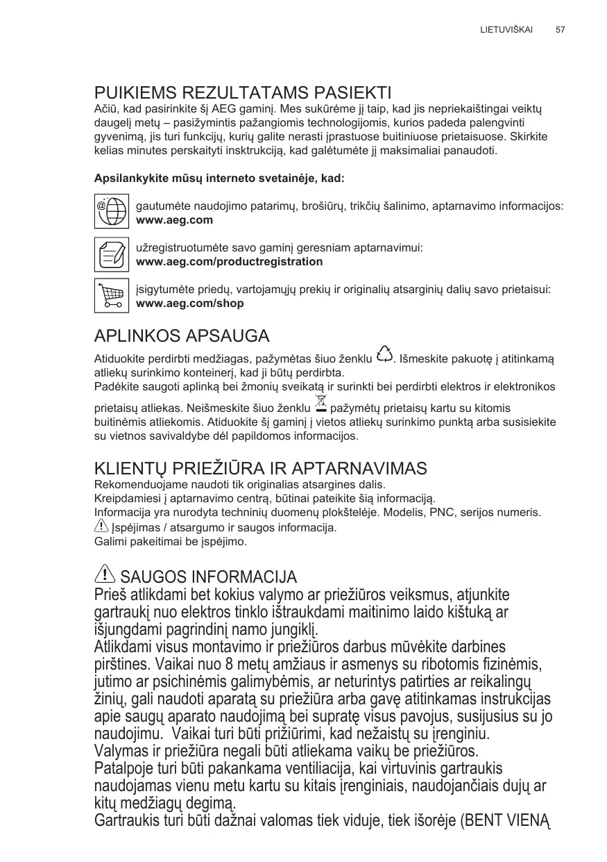 PUIKIEMS REZULTATAMS PASIEKTI Ačiū, kad pasirinkite šį AEG gaminį. Mes sukūrėme jį taip, kad jis nepriekaištingai veiktų daugelį metų – pasižymintis pažangiomis technologijomis, kurios padeda palengvinti gyvenimą, jis turi funkcijų, kurių galite nerasti įprastuose buitiniuose prietaisuose. Skirkite kelias minutes perskaityti insktrukciją, kad galėtumėte jį maksimaliai panaudoti. Apsilankykite mūsų interneto svetainėje, kad: gautumėte naudojimo patarimų, brošiūrų, trikčių šalinimo, aptarnavimo informacijos: www.aeg.com užregistruotumėte savo gaminį geresniam aptarnavimui: www.aeg.com/productregistration įsigytumėte priedų, vartojamųjų prekių ir originalių atsarginių dalių savo prietaisui: www.aeg.com/shop