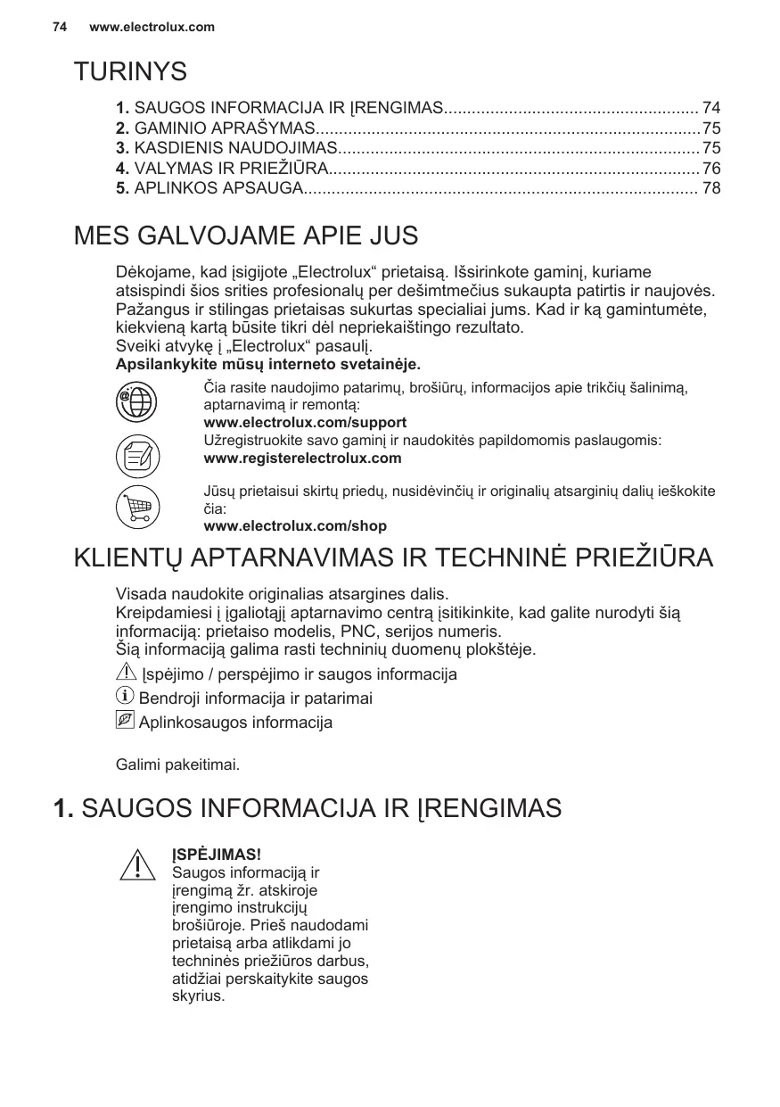 Dėkojame, kad įsigijote „Electrolux“ prietaisą. Išsirinkote gaminį, kuriame atsispindi šios srities profesionalų per dešimtmečius sukaupta patirtis ir naujovės. Pažangus ir stilingas prietaisas sukurtas specialiai jums. Kad ir ką gamintumėte, kiekvieną kartą būsite tikri dėl nepriekaištingo rezultato. Sveiki atvykę į „Electrolux“ pasaulį. Apsilankykite mūsų interneto svetainėje. Čia rasite naudojimo patarimų, brošiūrų, informacijos apie trikčių šalinimą, aptarnavimą ir remontą: www.electrolux.com/support Užregistruokite savo gaminį ir naudokitės papildomomis paslaugomis: www.registerelectrolux.com Jūsų prietaisui skirtų priedų, nusidėvinčių ir originalių atsarginių dalių ieškokite čia: www.electrolux.com/shop KLIENTŲ APTARNAVIMAS IR TECHNINĖ PRIEŽIŪRA Visada naudokite originalias atsargines dalis. Kreipdamiesi į įgaliotąjį aptarnavimo centrą įsitikinkite, kad galite nurodyti šią informaciją: prietaiso modelis, PNC, serijos numeris. Šią informaciją galima rasti techninių duomenų plokštėje. Įspėjimo / perspėjimo ir saugos informacija Bendroji informacija ir patarimai Aplinkosaugos informacija Galimi pakeitimai.
