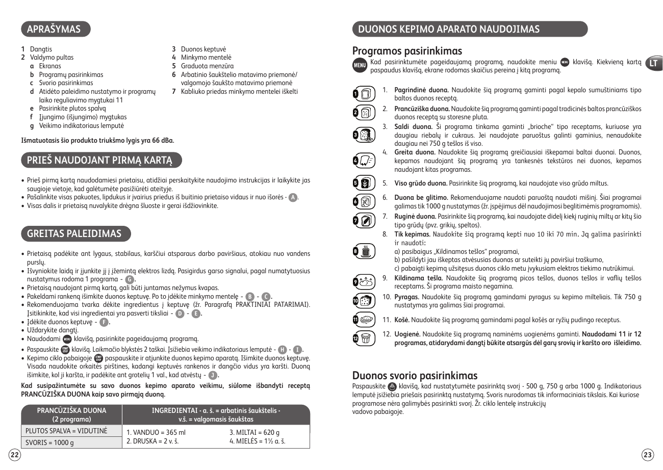 1. Pagrindinė duona. Naudokite šią programą gaminti pagal kepalo sumuštiniams tipo baltos duonos receptą. 2. Prancūziška duona. Naudokite šią programą gaminti pagal tradicinės baltos prancūziškos duonos receptą su storesne pluta. 3. Saldi duona. Ši programa tinkama gaminti „brioche“ tipo receptams, kuriuose yra daugiau riebalų ir cukraus. Jei naudojate paruoštus galinti gaminius, nenaudokite daugiau nei 750 g tešlos iš viso. 4. Greita duona. Naudokite šią programą greičiausiai iškepamai baltai duonai. Duonos, kepamos naudojant šią programą yra tankesnės tekstūros nei duonos, kepamos naudojant kitas programas. 5. Viso grūdo duona. Pasirinkite šią programą, kai naudojate viso grūdo miltus. 6. Duona be glitimo. Rekomenduojame naudoti paruoštą naudoti mišinį. Šiai programai galimas tik 1000 g nustatymas (žr. įspėjimus dėl naudojimosi beglitimėmis programomis). 7. Ruginė duona. Pasirinkite šią programą, kai naudojate didelį kiekį ruginių miltų ar kitų šio tipo grūdų (pvz. grikių, speltos). 8. Tik kepimas. Naudokite šią programą kepti nuo 10 iki 70 min. Ją galima pasirinkti ir naudoti: a) pasibaigus „Kildinamos tešlos“ programai, b) pašildyti jau iškeptas atvėsusias duonas ar suteikti jų paviršiui traškumo, c) pabaigti kepimą užsitęsus duonos ciklo metu įvykusiam elektros tiekimo nutrūkimui. 9. Kildinama tešla. Naudokite šią programą picos tešlos, duonos tešlos ir vaflių tešlos receptams. Ši programa maisto negamina. 10. Pyragas. Naudokite šią programą gamindami pyragus su kepimo milteliais. Tik 750 g nustatymas yra galimas šiai programai. 11. Košė. Naudokite šią programą gamindami pagal košės ar ryžių pudingo receptus. 12. Uogienė. Naudokite šią programą naminėms uogienėms gaminti. Naudodami 11 ir 12 programas, atidarydami dangtį būkite atsargūs dėl garų srovių ir karšto oro išleidimo.