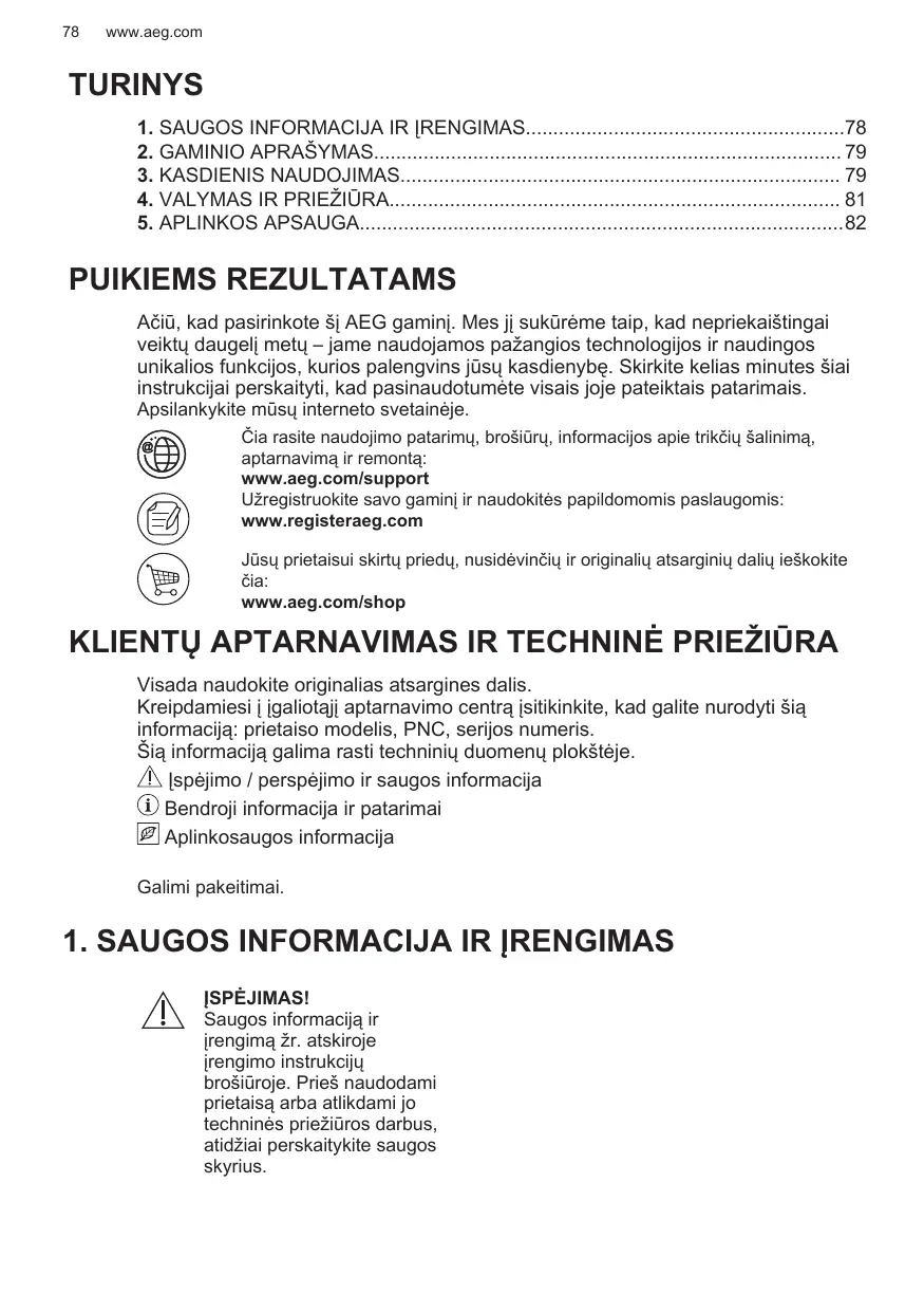 PUIKIEMS REZULTATAMS Ačiū, kad pasirinkote šį AEG gaminį. Mes jį sukūrėme taip, kad nepriekaištingai veiktų daugelį metų – jame naudojamos pažangios technologijos ir naudingos unikalios funkcijos, kurios palengvins jūsų kasdienybę. Skirkite kelias minutes šiai instrukcijai perskaityti, kad pasinaudotumėte visais joje pateiktais patarimais. Apsilankykite mūsų interneto svetainėje. Čia rasite naudojimo patarimų, brošiūrų, informacijos apie trikčių šalinimą, aptarnavimą ir remontą: www.aeg.com/support Užregistruokite savo gaminį ir naudokitės papildomomis paslaugomis: www.registeraeg.com Jūsų prietaisui skirtų priedų, nusidėvinčių ir originalių atsarginių dalių ieškokite čia: www.aeg.com/shop KLIENTŲ APTARNAVIMAS IR TECHNINĖ PRIEŽIŪRA Visada naudokite originalias atsargines dalis. Kreipdamiesi į įgaliotąjį aptarnavimo centrą įsitikinkite, kad galite nurodyti šią informaciją: prietaiso modelis, PNC, serijos numeris. Šią informaciją galima rasti techninių duomenų plokštėje. Įspėjimo / perspėjimo ir saugos informacija Bendroji informacija ir patarimai Aplinkosaugos informacija Galimi pakeitimai.