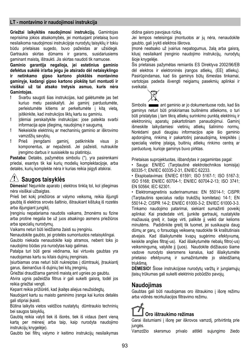 Les enfants doivent être surveillés afin qu’ils ne jouent pas avec l’appareil. Ne jamais utiliser la hotte sans que la grille ne soit montée correctement! La hotte ne doit JAMAIS être utilisée comme plan pour déposer quelque chose sauf si cela est expressément indiqué. Quand la hotte est utilisée en même temps que d’autres appareils à combustion de gaz ou d’autres combustibles, le local doit disposer d’une ventilation suffisante. L’air aspiré ne doit jamais être envoyé dans un conduit utilisé pour l’évacuation des fumées produites par des appareils à combustion de gaz ou d’autres combustibles. Il est formellement interdit de faire flamber les aliments sous la hotte. L’utilisation de flammes libres peut entraîner des dégâts aux filtres et peut donner lieu à des incendies, il faut donc les éviter à tout prix. La friture d’aliments doit être réalisée sous contrôle pour éviter