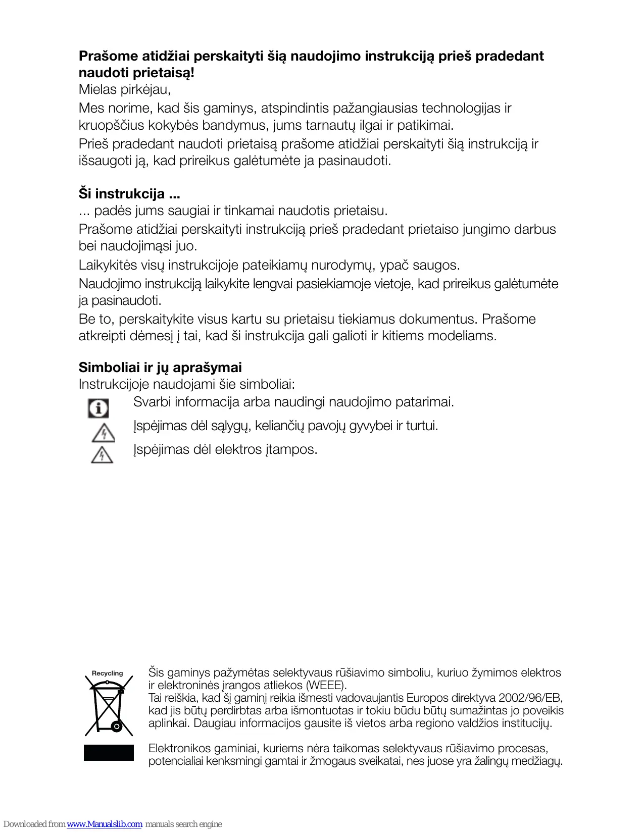 SK Prašome atidžiai perskaityti šią naudojimo instrukciją prieš pradedant naudoti prietaisą! Mielas pirkėjau, Mes norime, kad šis gaminys, atspindintis pažangiausias technologijas ir kruopščius kokybės bandymus, jums tarnautų ilgai ir patikimai. Prieš pradedant naudoti prietaisą prašome atidžiai perskaityti šią instrukciją ir išsaugoti ją, kad prireikus galėtumėte ja pasinaudoti. Ši instrukcija ... ... padės jums saugiai ir tinkamai naudotis prietaisu. Prašome atidžiai perskaityti instrukciją prieš pradedant prietaiso jungimo darbus bei naudojimąsi juo. Laikykitės visų instrukcijoje pateikiamų nurodymų, ypač saugos. Naudojimo instrukciją laikykite lengvai pasiekiamoje vietoje, kad prireikus galėtumėte ja pasinaudoti. Be to, perskaitykite visus kartu su prietaisu tiekiamus dokumentus. Prašome atkreipti dėmesį į tai, kad ši instrukcija gali galioti ir kitiems modeliams. Simboliai ir jų aprašymai Instrukcijoje naudojami šie simboliai: Svarbi informacija arba naudingi naudojimo patarimai. Įspėjimas dėl sąlygų, keliančių pavojų gyvybei ir turtui. Įspėjimas dėl elektros įtampos.