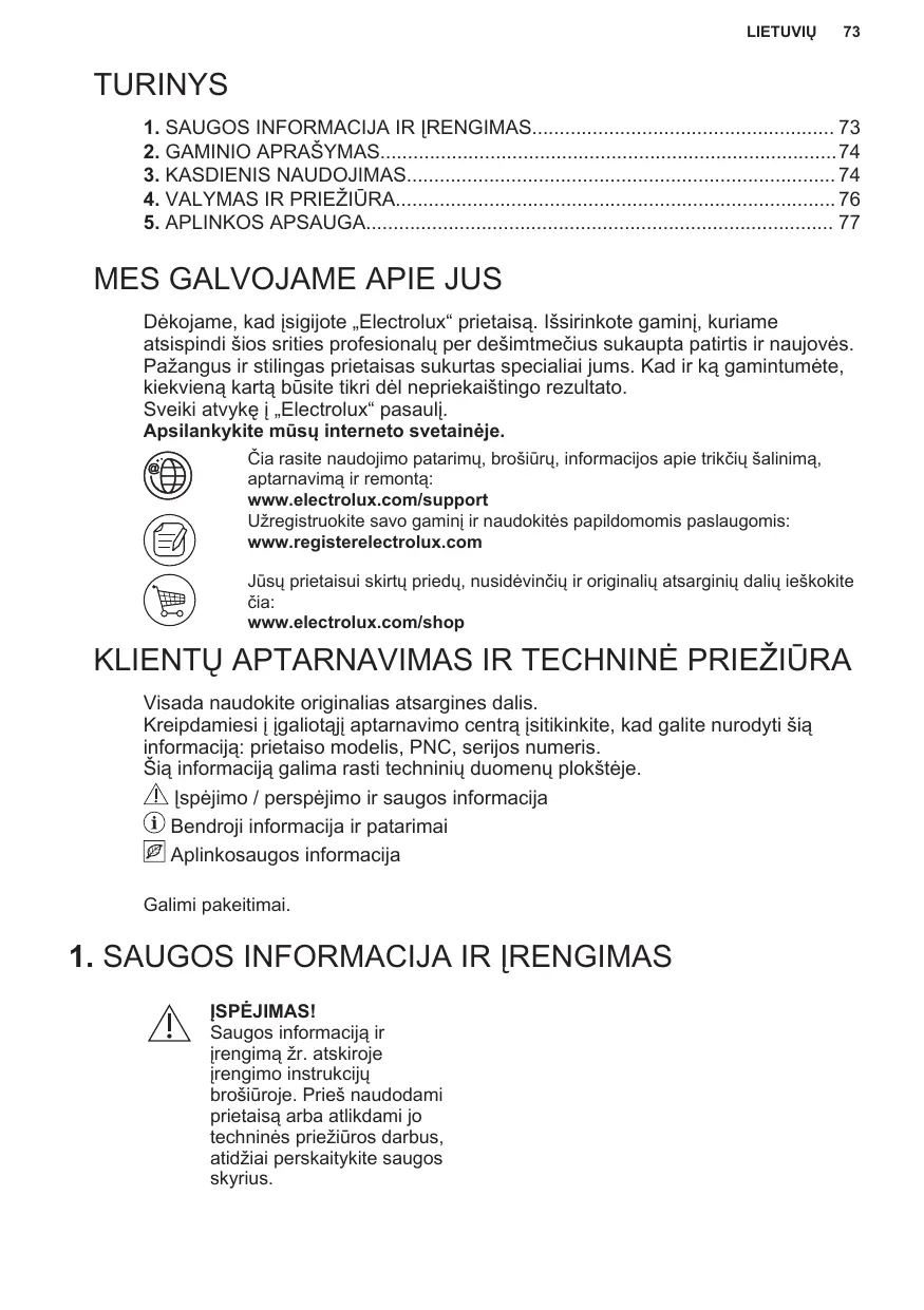 Dėkojame, kad įsigijote „Electrolux“ prietaisą. Išsirinkote gaminį, kuriame atsispindi šios srities profesionalų per dešimtmečius sukaupta patirtis ir naujovės. Pažangus ir stilingas prietaisas sukurtas specialiai jums. Kad ir ką gamintumėte, kiekvieną kartą būsite tikri dėl nepriekaištingo rezultato. Sveiki atvykę į „Electrolux“ pasaulį. Apsilankykite mūsų interneto svetainėje. Čia rasite naudojimo patarimų, brošiūrų, informacijos apie trikčių šalinimą, aptarnavimą ir remontą: www.electrolux.com/support Užregistruokite savo gaminį ir naudokitės papildomomis paslaugomis: www.registerelectrolux.com Jūsų prietaisui skirtų priedų, nusidėvinčių ir originalių atsarginių dalių ieškokite čia: www.electrolux.com/shop KLIENTŲ APTARNAVIMAS IR TECHNINĖ PRIEŽIŪRA Visada naudokite originalias atsargines dalis. Kreipdamiesi į įgaliotąjį aptarnavimo centrą įsitikinkite, kad galite nurodyti šią informaciją: prietaiso modelis, PNC, serijos numeris. Šią informaciją galima rasti techninių duomenų plokštėje. Įspėjimo / perspėjimo ir saugos informacija Bendroji informacija ir patarimai Aplinkosaugos informacija Galimi pakeitimai.
