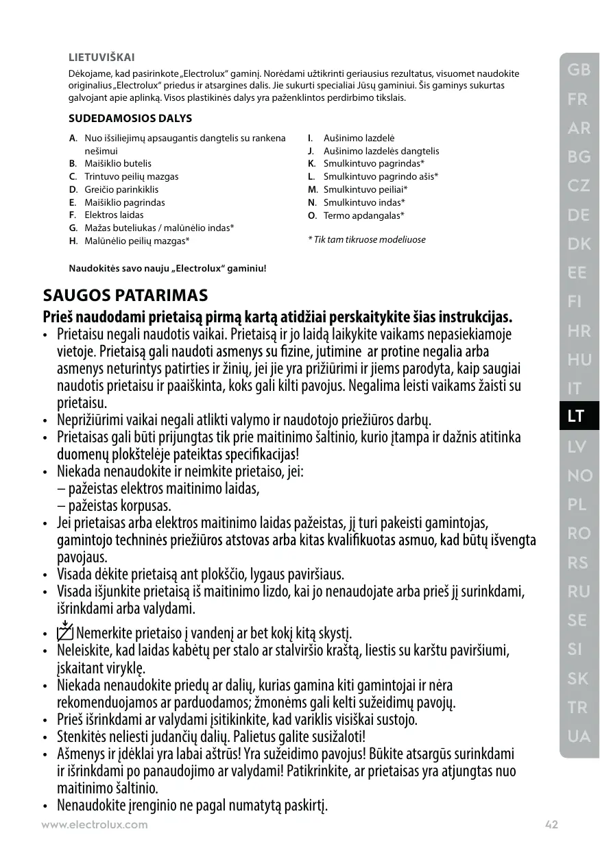 LIETUVIŠKAI GB Dėkojame, kad pasirinkote „Electrolux“ gaminį. Norėdami užtikrinti geriausius rezultatus, visuomet naudokite originalius „Electrolux“ priedus ir atsargines dalis. Jie sukurti specialiai Jūsų gaminiui. Šis gaminys sukurtas galvojant apie aplinką. Visos plastikinės dalys yra paženklintos perdirbimo tikslais.