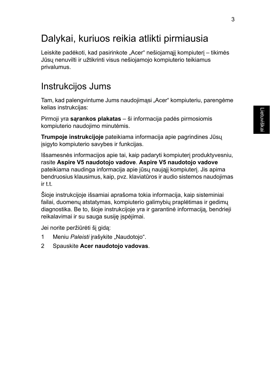 Dalykai, kuriuos reikia atlikti pirmiausia Leiskite padėkoti, kad pasirinkote „Acer“ nešiojamąjį kompiuterį – tikimės Jūsų nenuvilti ir užtikrinti visus nešiojamojo kompiuterio teikiamus privalumus. Instrukcijos Jums Pirmoji yra sąrankos plakatas – ši informacija padės pirmosiomis kompiuterio naudojimo minutėmis. Trumpoje instrukcijoje pateikiama informacija apie pagrindines Jūsų įsigyto kompiuterio savybes ir funkcijas. Išsamesnės informacijos apie tai, kaip padaryti kompiuterį produktyvesniu, rasite Aspire V5 naudotojo vadove. Aspire V5 naudotojo vadove pateikiama naudinga informacija apie jūsų naująjį kompiuterį. Jis apima bendruosius klausimus, kaip, pvz. klaviatūros ir audio sistemos naudojimas ir t.t. Šioje instrukcijoje išsamiai aprašoma tokia informacija, kaip sisteminiai failai, duomenų atstatymas, kompiuterio galimybių praplėtimas ir gedimų diagnostika. Be to, šioje instrukcijoje yra ir garantinė informaciją, bendrieji reikalavimai ir su sauga susiję įspėjimai. Jei norite peržiūrėti šį gidą:
